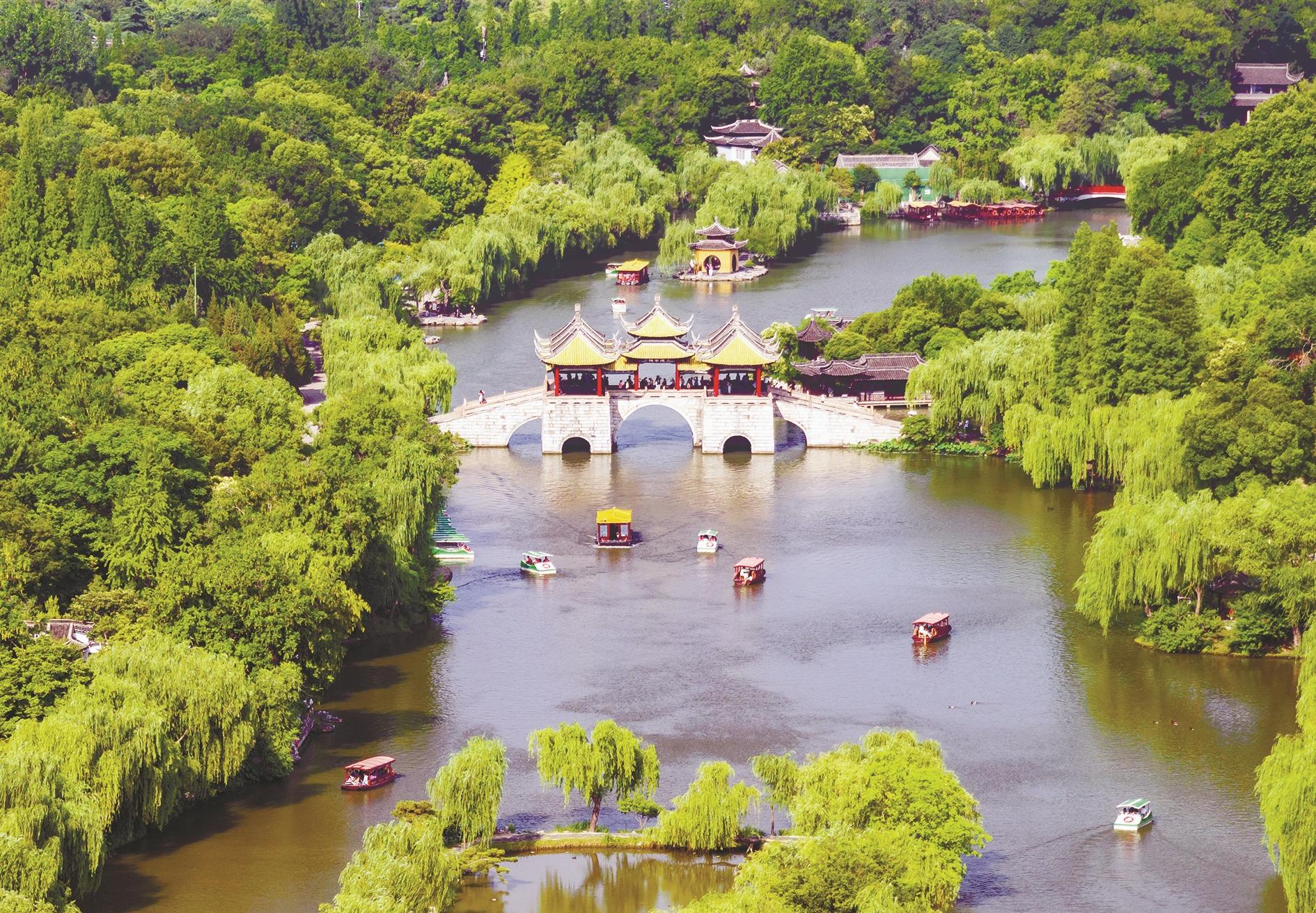 6月10日,游客在江苏扬州瘦西湖风景区游览(无人机照片)。记者10日从文化和旅游部获悉,2024年端午节假期,全国文化和旅游市场总体平稳有序。据文化和旅游部数据中心测算,全国国内旅游出游合计1.1亿人次,同比增长6.3%。