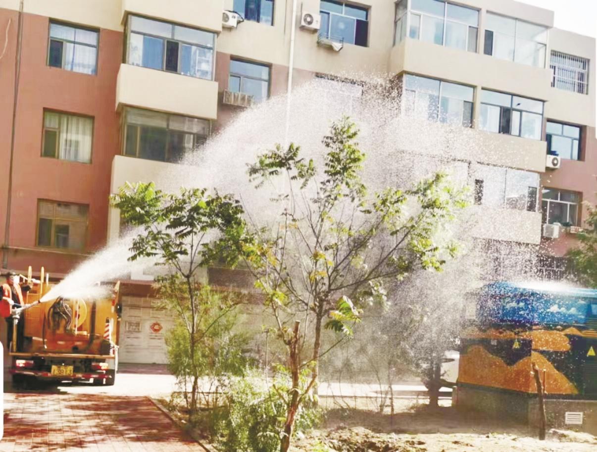 近日,海北街道东环路社区居民反映金鑫小区内存在树木长蚜虫的现象。工作人员联合物业制定了“灭虫”方案,为绿植“保驾护航”。 (毕晓敏 摄)