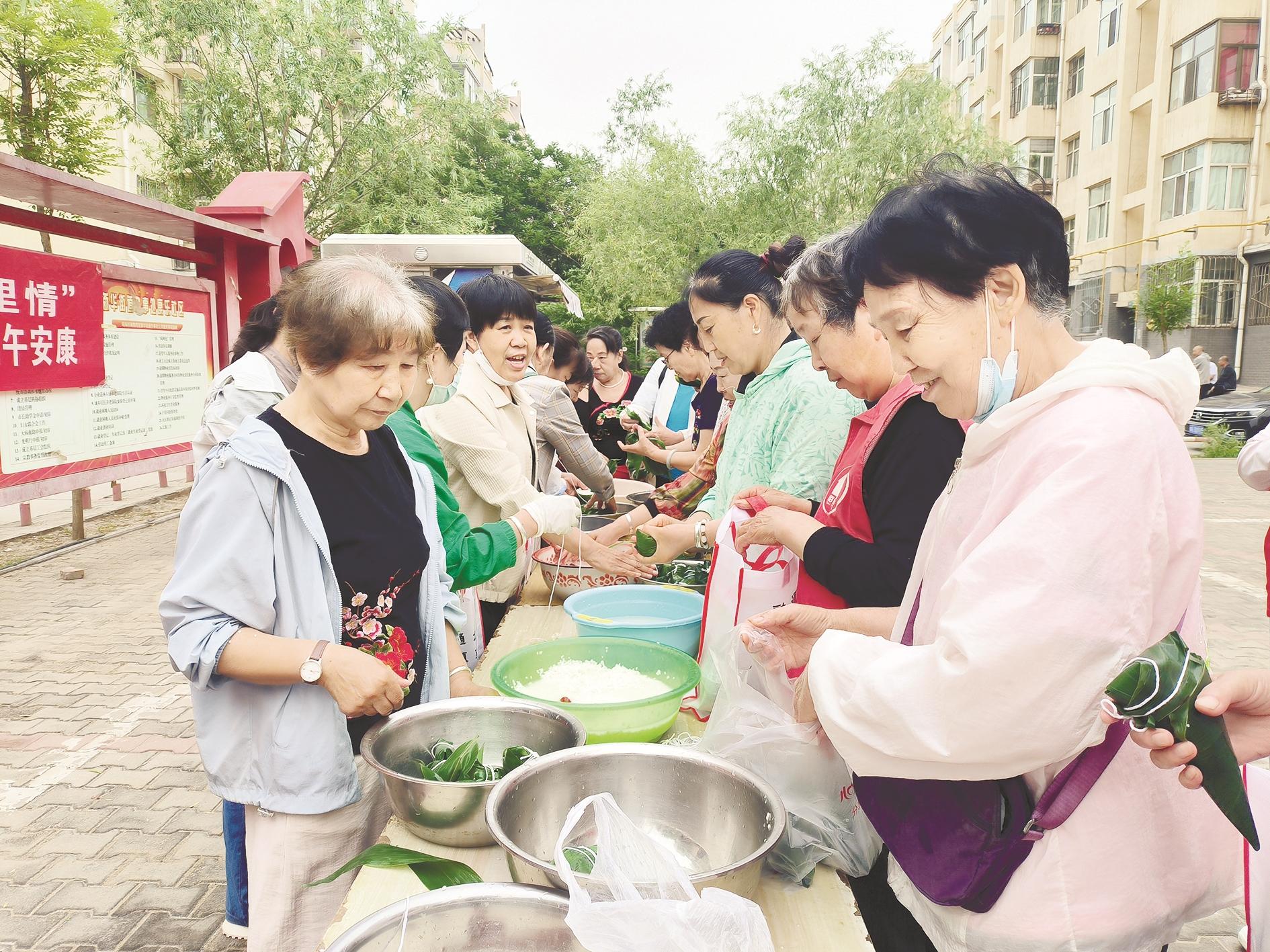 近日,海勃湾区新华街道康乐社区党委联合市应急管理局、海勃湾区图书馆、内蒙古银行乌海电力支行及辖区物业公司共同开展“粽叶飘香庆端午 幸福和谐邻里情”、防范电信诈骗知识讲座等活动,为辖区居民营造一个喜庆、安康的节日氛围。图为辖区居民包粽子。 (李浩 摄)