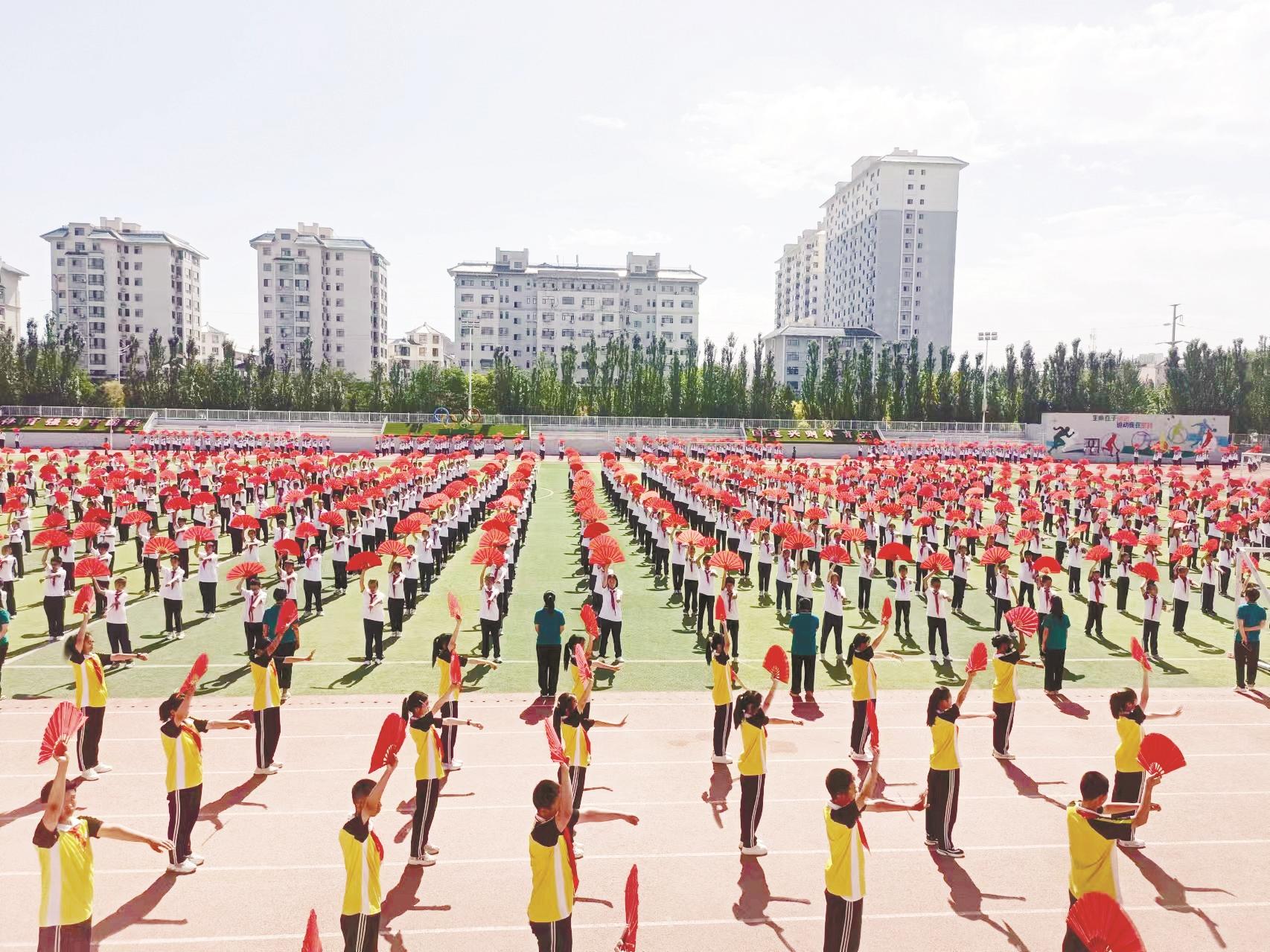 今年以来,全市教育系统坚持“五育并举”,积极推进义务教育优质均衡发展,继续深化大课间的活动形式和内容,打造快乐、健康、积极向上的阳光大课间模式,进一步延伸和提高阳光大课间的外延和内涵,为学生的身心健康成长不断注入新活力。图为市第九中学学生课间操表演。(刘春霞 摄)