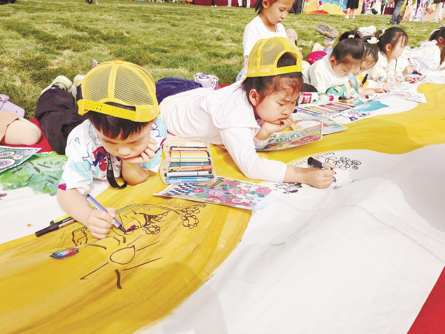 近日,乌达区漠海山境内的研学活动中,孩子们或蹲、或趴,用淳朴的童心在百米长卷上勾勒未来蓝图,用画笔描绘出他们心中的多彩世界。 (张丽阳 摄)