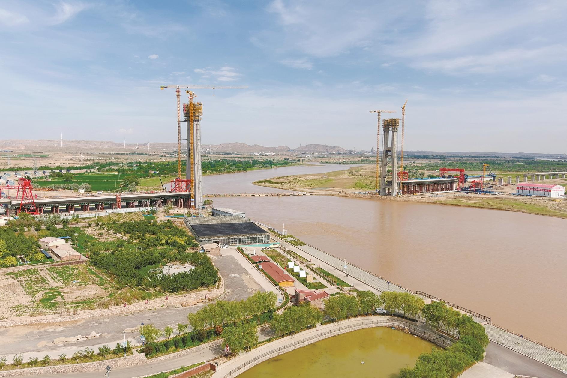 近日,乌海黄河特大桥工程主墩主塔顺利封顶,为项目按期通车奠定坚实基础。据了解,乌海黄河特大桥全长2190.79米,设计墩台51个,主跨长310米,次边跨和边跨长160米,采用钢混斜拉桥跨越黄河。项目建成后,将对推动我市经济社会高质量发展发挥重要作用。(王超 摄)