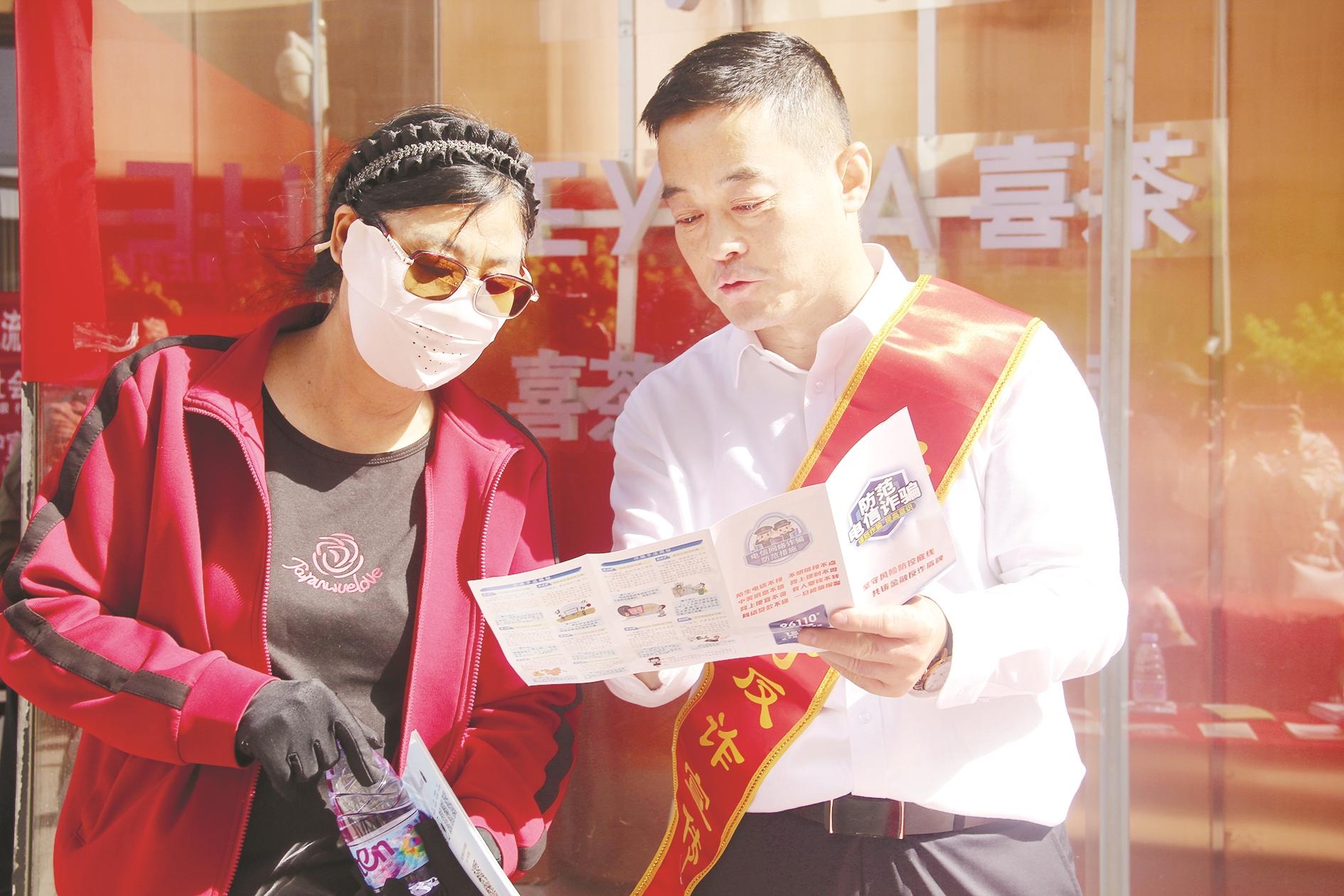 近日,工行乌海分行工作人员在乌海万达广场开展防电信诈骗宣传活动,进一步增强人民群众防范意识。 (陈洋 摄)