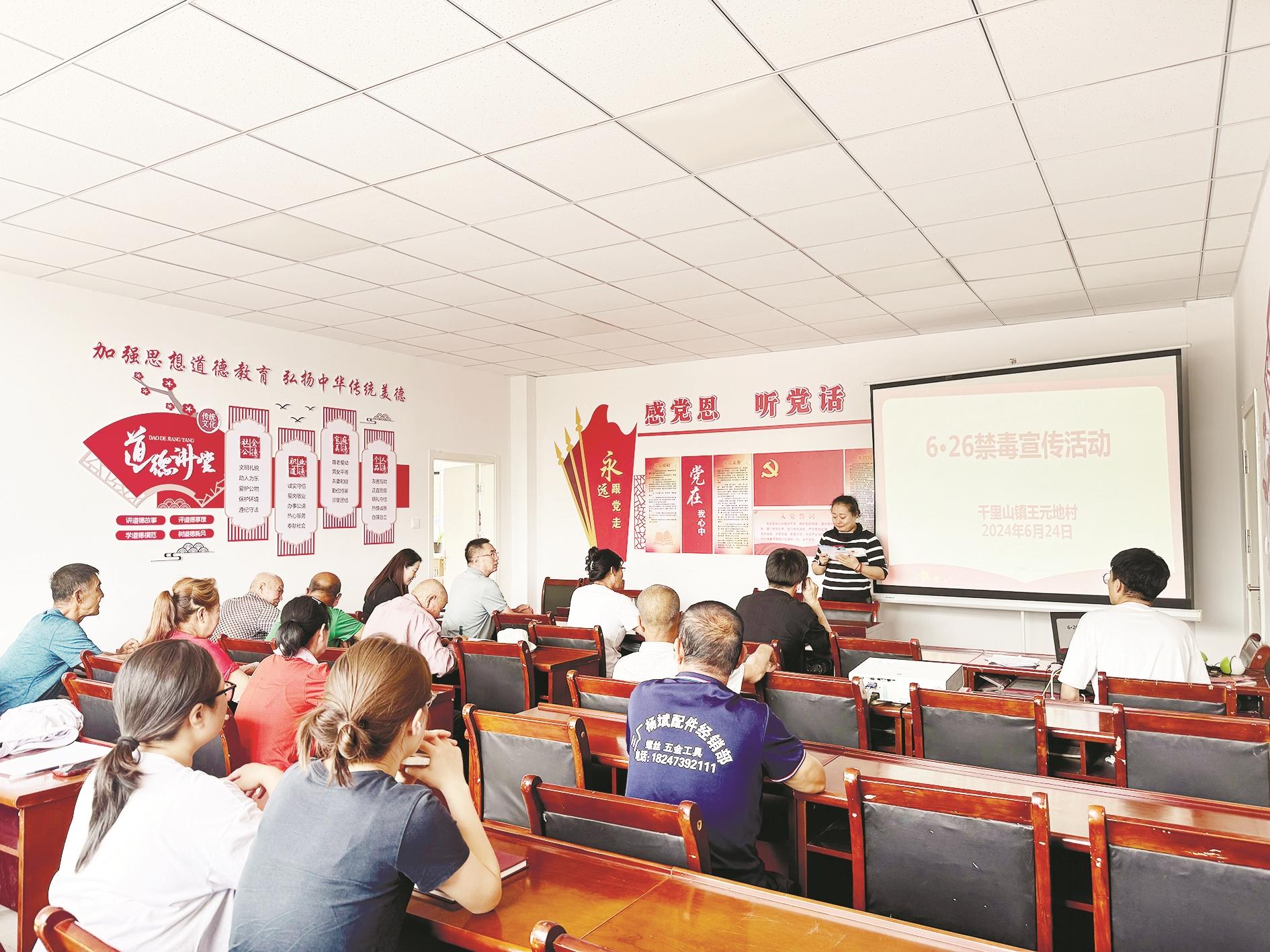 6月24日,海勃湾区千里山镇王元地村举办国际禁毒日宣传活动。工作人员向村民宣传毒品的危害和禁毒的重要性,提醒广大村民要时常监督身边的人远离毒品,发现涉毒行为要自觉抵制并及时报警。 (毕晓敏 摄)