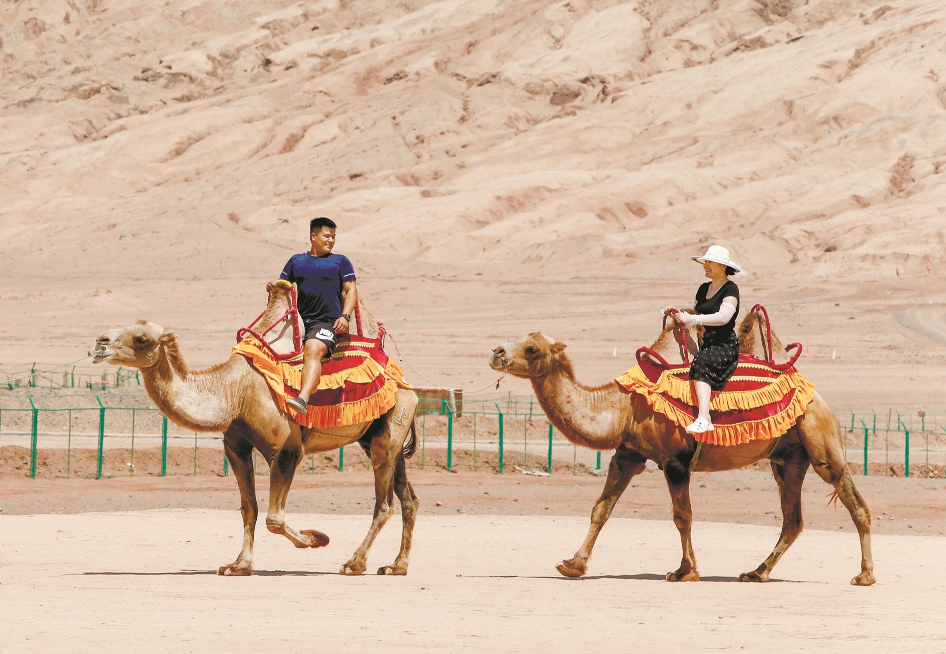 6月29日,游客在位于吐鲁番市的火焰山景区骑骆驼游玩。