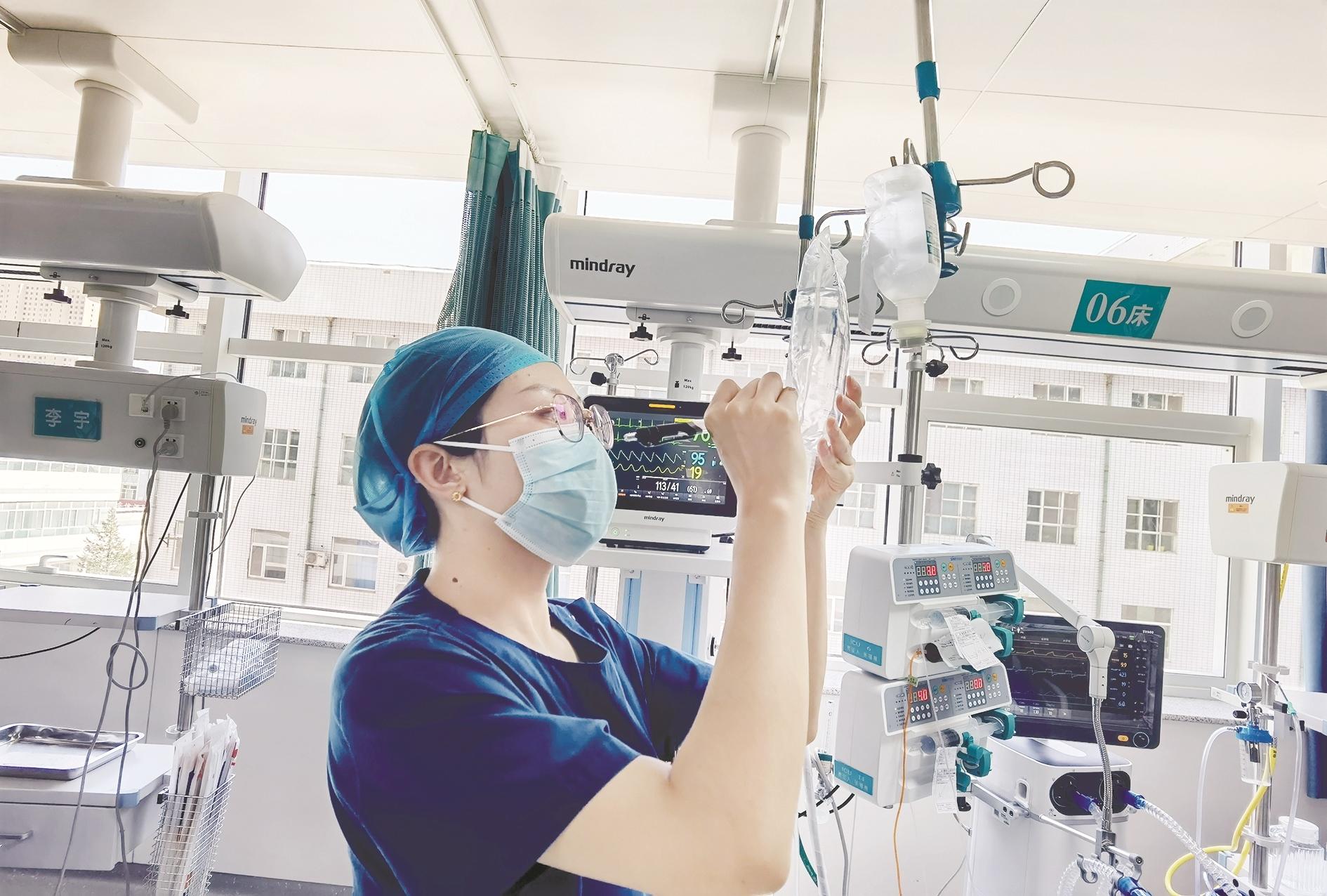 李宇介绍,重症医学科的护士不仅要做好患者医学、生理上的看护,还要对一些有情绪的清醒患者进行心理疏导。医学观察不仅仅是看仪器发没发出报警,还要通过仪器结合患者面部、肢体等进行全方位的观察评估,及时发现异常,进行救治。“等到仪器发出报警,情况已经很紧急了,我们必须时时刻刻守在病床前。”她说,“躺在这里的患者生活不能自理,口腔护理、饮食护理、全身擦浴等基础护理,都需要护士来完成。患者随时可能出现紧急情况需要急救,这时候急救医护人员要全部上阵,插管、心肺复苏、静脉给药等都要及时配合才能从死神手里抢回一条生命。”