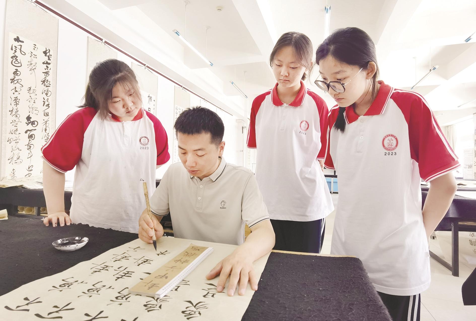 6月27日下午,乌海市第一中学的书法教室里,书法教师王松松正在给3名热爱书法的学生作书写示范和讲解。看着学生有模有样地练习,王松松露出了欣慰的笑容。