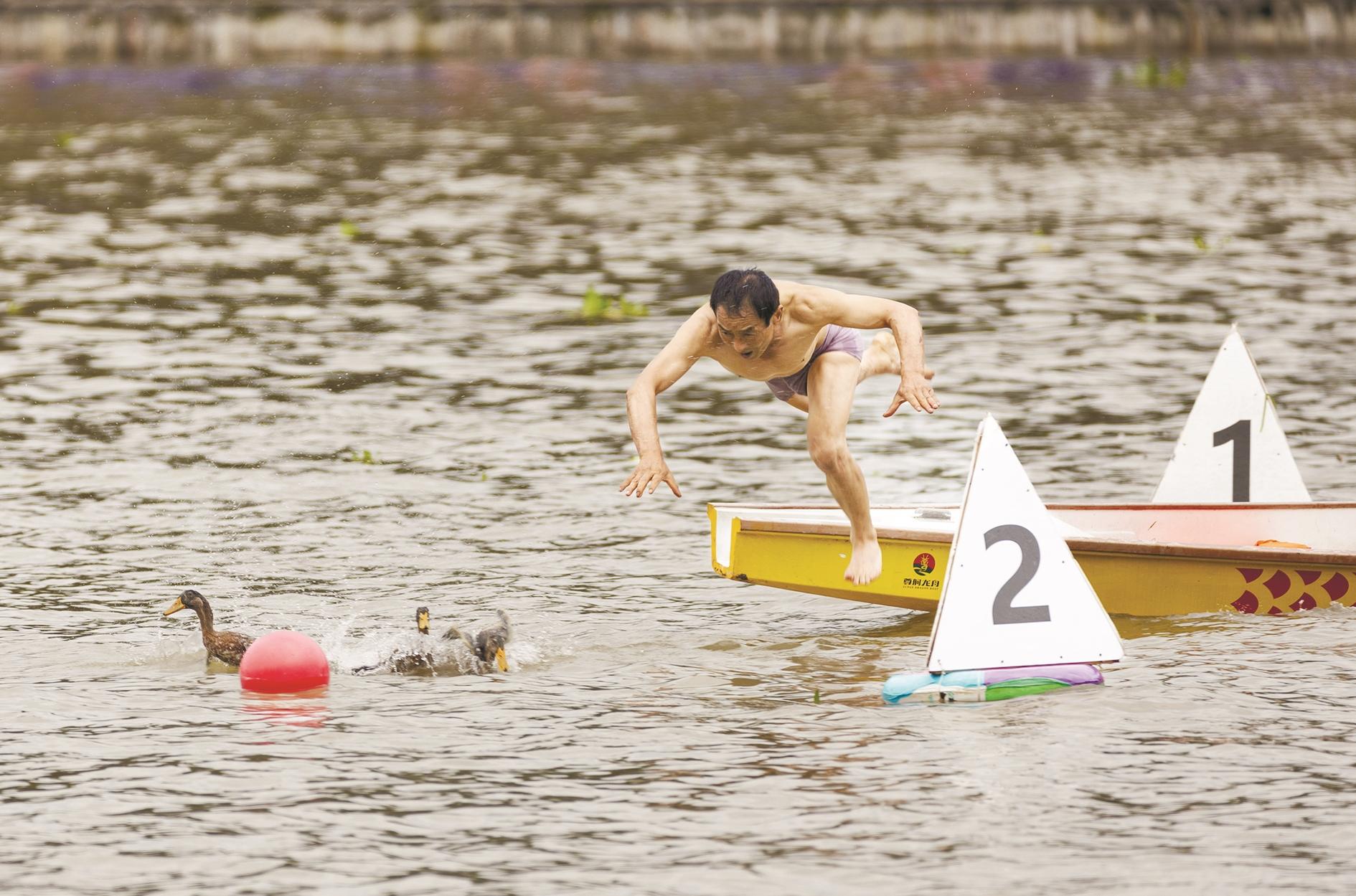 6月23日,一名男子跃入水中抢鸭子。当日,五通桥区第21届龙舟文化展演活动在四川省乐山市五通桥区小西湖举行,来自全区24支龙舟队参与比拼,随后还进行抢鸭子等民俗活动,吸引众多群众和游客观赏。五通桥龙舟承载着悠久的盐业文明,孕育了独特的“川派龙舟”文化。 新华社记者 江宏景 摄