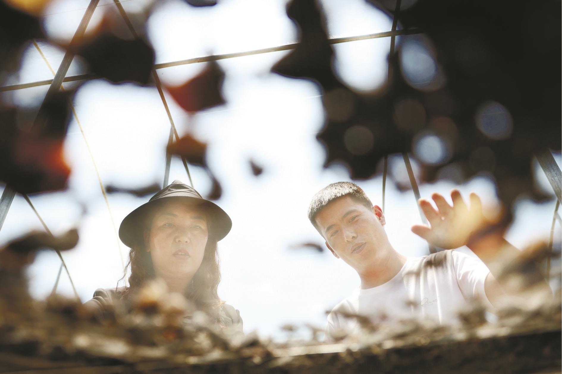 6月26日,卢永续(右)和卓尼县农业技术推广站高级农艺师杨瑞芳在木耳种植大棚内查看木耳晾晒情况。1994年出生的卢永续是甘肃省甘南藏族自治州卓尼县木耳镇一名从事木耳种植的“新农人”。大学毕业后在天津工作了3年的卢永续于2021年辞去城市工作,怀揣着对农业的热爱回到家乡,和几名同学组成团队,在村里流转土地进行木耳等食用菌种植,开启了自己的田园“创客”生活。三年来,卢永续和伙伴扎根田间,将现代农业种植模式和管理经验植入合作社,探索高效种植道路,通过直播带货和线下采摘体验扩大知名度。如今,卢永续所在的团队已经打造了自己的食用菌品牌,逐步形成了集种植、包装、物流、销售于一体的完整体系,在自身产业不断发展的同时,带动周边300多名村民就业增收。从城市到田间,卢永续的生活轨迹发生了变化,他所在的团队也有了新的大学毕业生的加入。在他看来,乡村振兴是年轻人施展才华的大舞台,只要脚踏实地,逐梦“兴农路”的未来将会有无限可能。 新华社记者 陈斌 摄