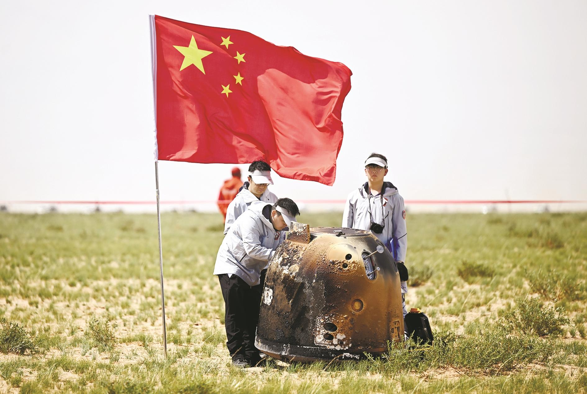 六月二十五日十四时七分,嫦娥六号返回器携带来自月背的月球样品安全着陆在内蒙古四子王旗预定区域,探月工程嫦娥六号任务取得圆满成功。 新华社记者 贝赫 摄