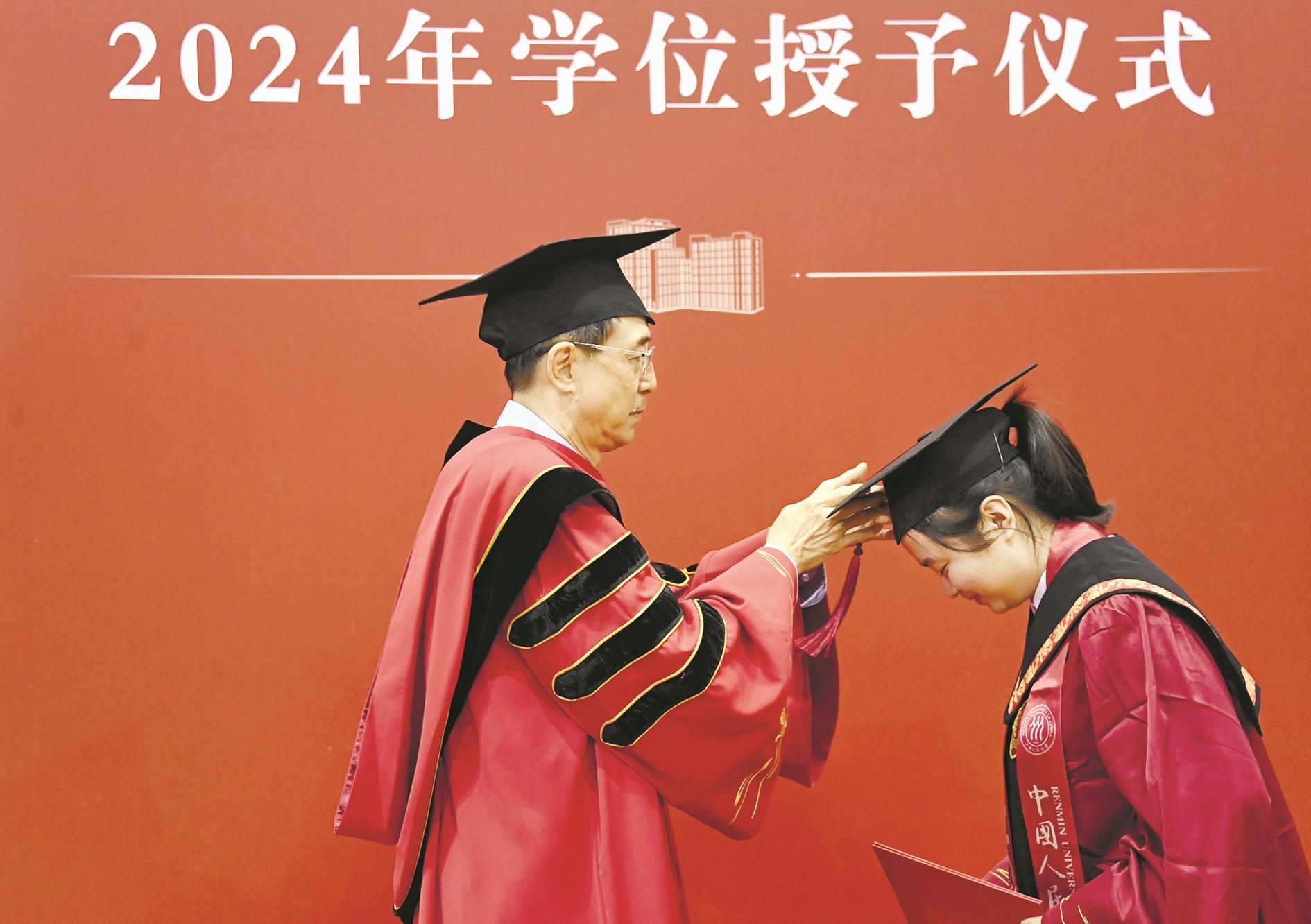 6月23日在中国人民大学拍摄的学位授予仪式现场。 当日,中国人民大学举办2024年毕业日系列活动,包括毕业典礼、学位授予仪式、青春歌会等。据了解,今年中国人民大学共有8300余名毕业生学成毕业,踏上新的人生征程。 新华社记者 任超 摄