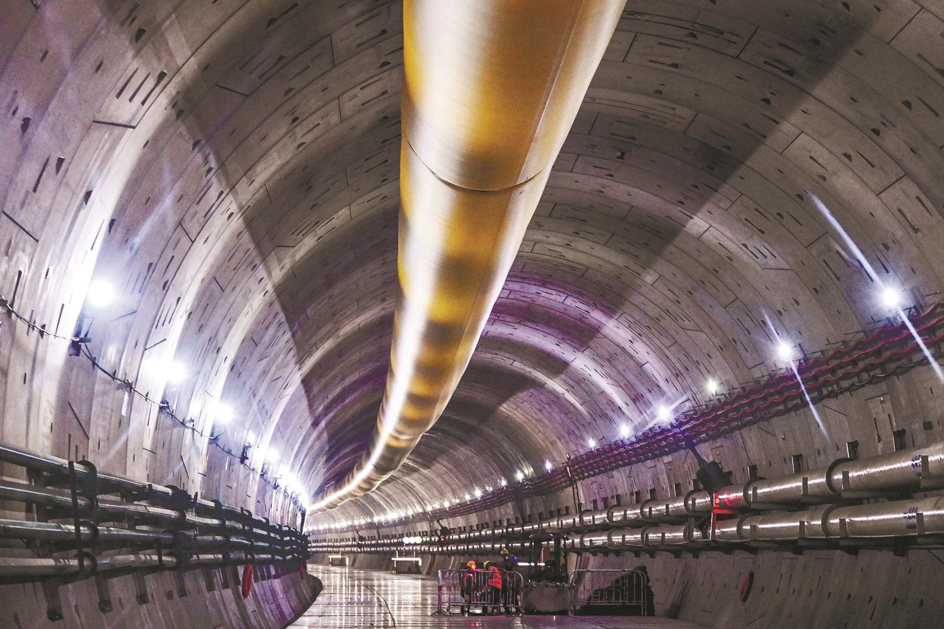 6月22日,施工人员在深江铁路珠江口隧道内作业。当日,在深江铁路珠江口隧道海底102米处,中铁十四局“深江1号”盾构机安全掘进至1720环,成功穿越海底17条断裂带,即将抵达盾构段最低点海底106米。深江铁路建成通车后将把深圳、东莞、广州、中山、江门这五座大湾区城市更紧密连接在一起,实现深圳前海自贸区与广州南沙自贸区半小时高铁互联互通,助力打造“轨道上的大湾区”。 新华社记者 刘大伟 摄