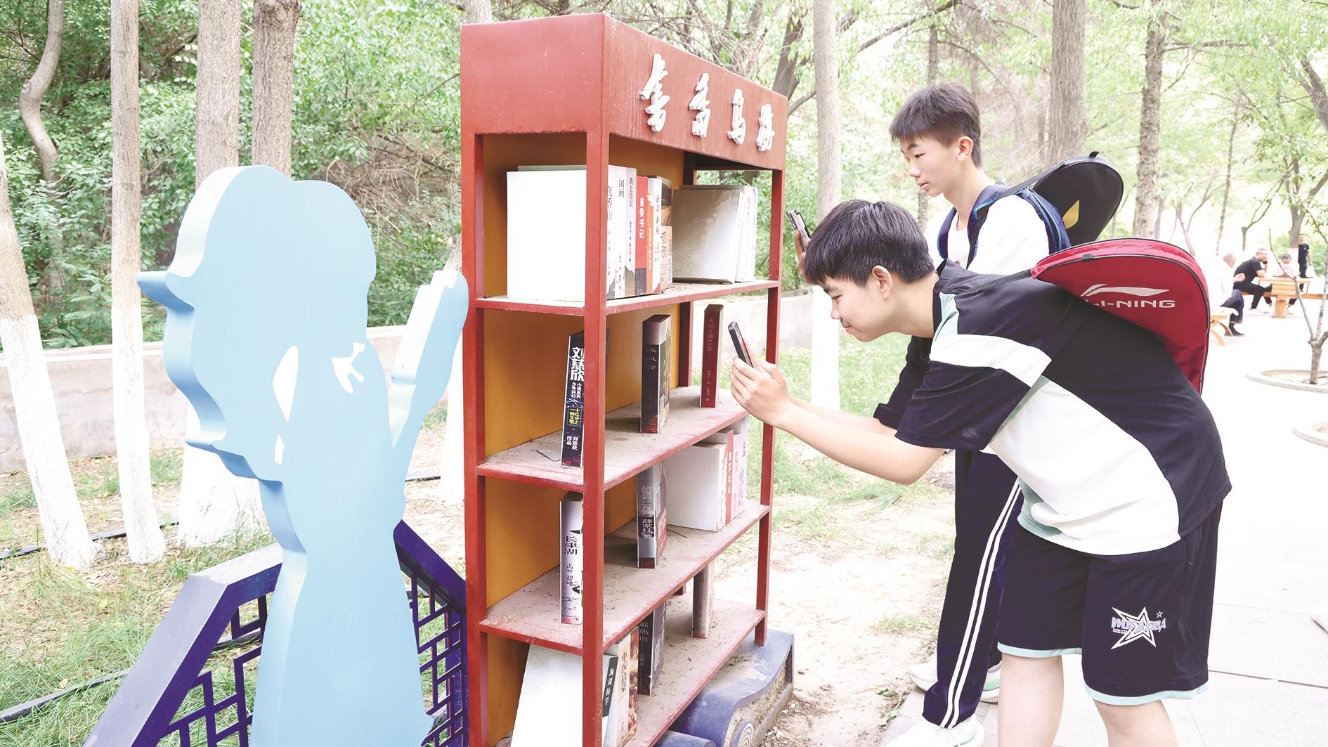 6月23日清晨,记者来到市运动公园,从南门沿健身步道前行,看到不少市民静坐在苍翠欲滴的大树下,手捧报纸或书籍细细品读,还有几名青年拿着手机扫码阅读。