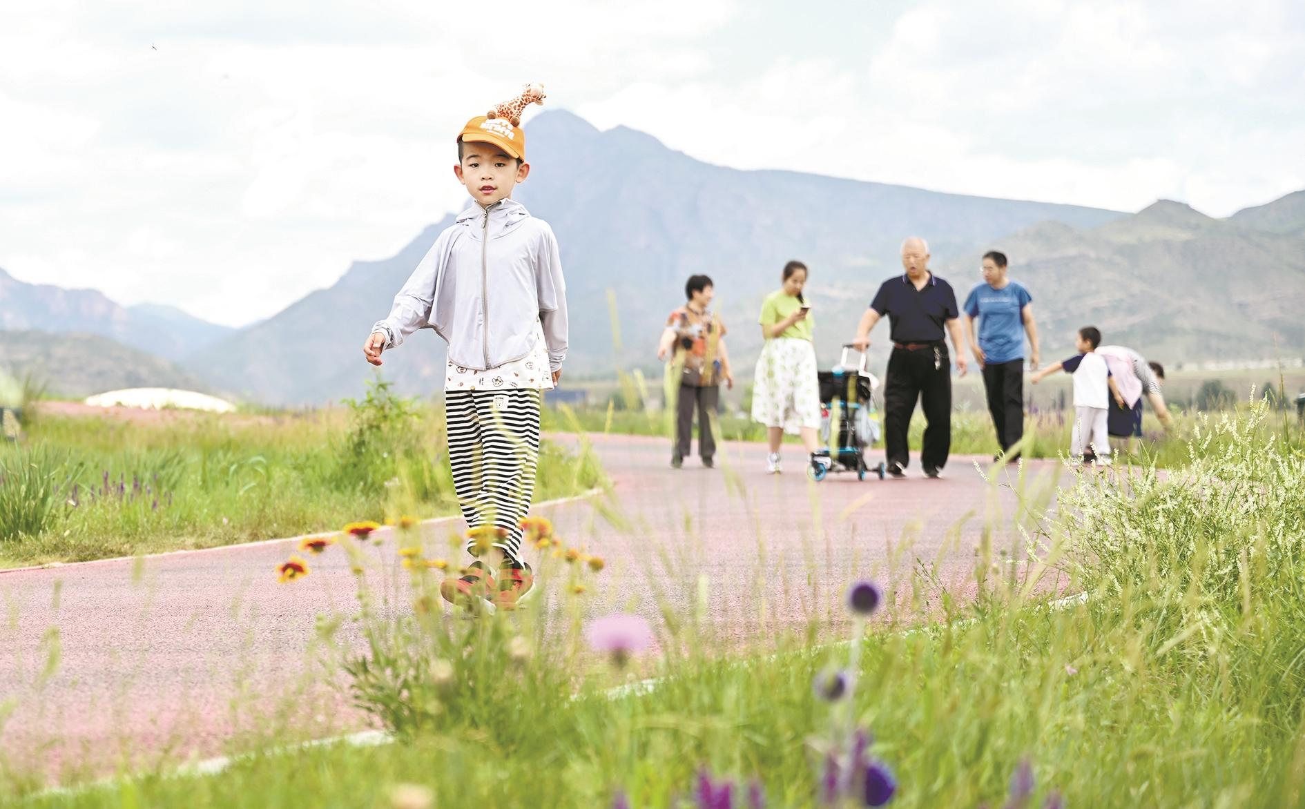 6月30日,游客在敕勒川草原游玩。夏日,位于内蒙古呼和浩特市的敕勒川草原上野花盛开、草色怡人,吸引市民游客前来赏景游玩。敕勒川草原位于呼和浩特市东北部的阴山山脉大青山南麓。2012年以来,呼和浩特市实施阴山山脉大青山南坡综合治理工程,积极修复敕勒川草原,使得当地生态环境持续好转。