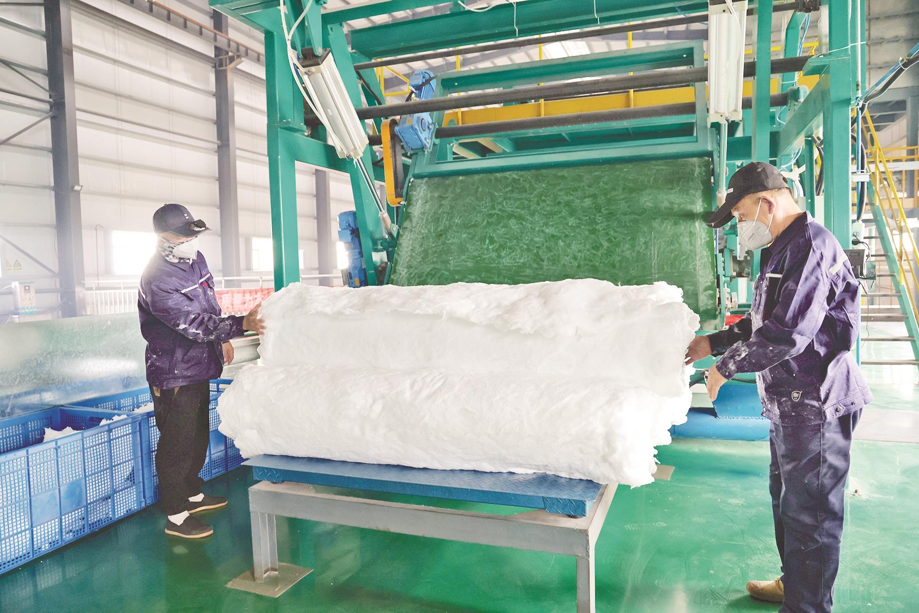 近日,记者在内蒙古世环新材料股份有限公司的生产厂房里看到,胶辊拉丝机、吹棉机等设备加快运行,雪白的玻璃纤维棉通过履带传输到包装端,工人们在紧锣密鼓地出货打包。