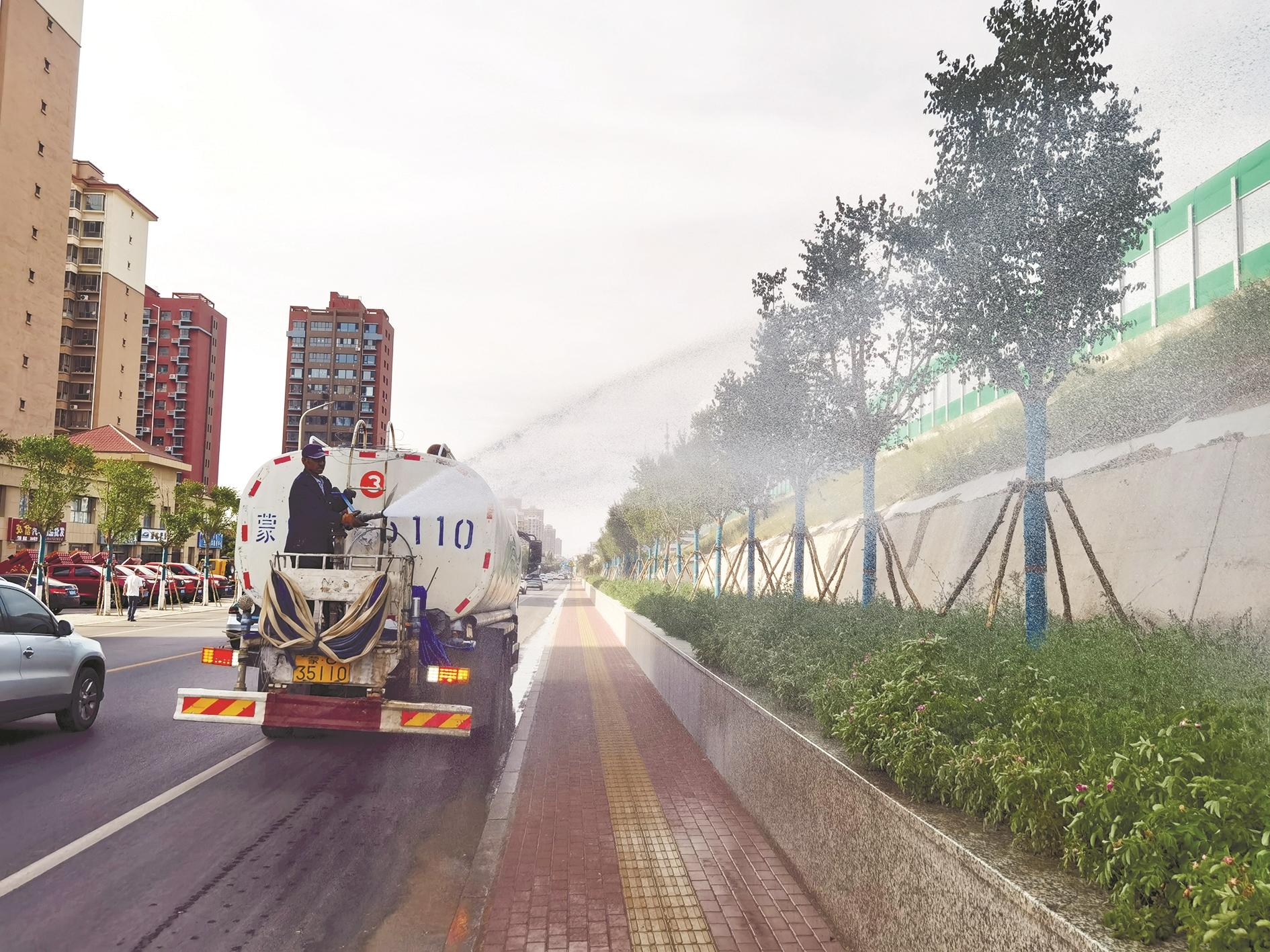 沿海拉公路向北进发,新铺设的道路宽敞平整、标线清晰,路两侧的绿化带被整修一新,中分绿化带内的对节白蜡、金叶榆、太阳李等乔木高低错落,道路绿化颜值让驾乘变得舒适愉悦。今春栽种的树木被园林工人细心照料,或包裹保湿布,或悬挂营养液,或罩着遮阴网。一名工人介绍,大树移栽到此,根系容易受损,导致吸收水分和养分的能力降低,加之叶片水分蒸发,很容易干枯甚至死亡。用输营养液的方法给树木补充养分,能让其顺利成活。