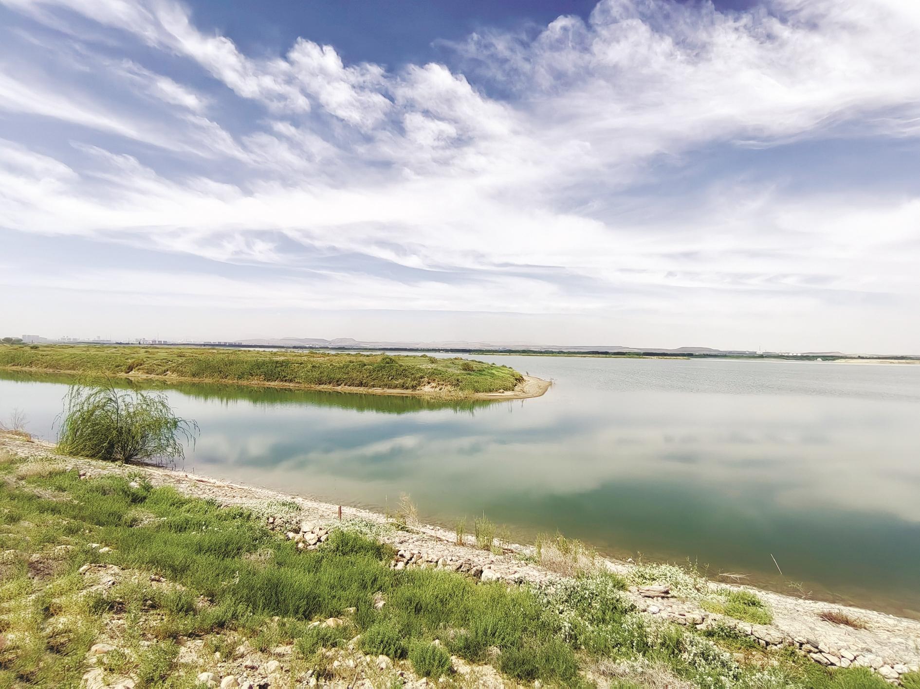 时至盛夏,乌兰淖尔湖畔,云彩美如画,河边的青草碧绿,水面清澈如镜,倒映着天空、浮云,美丽壮观。 (张丽阳 摄)