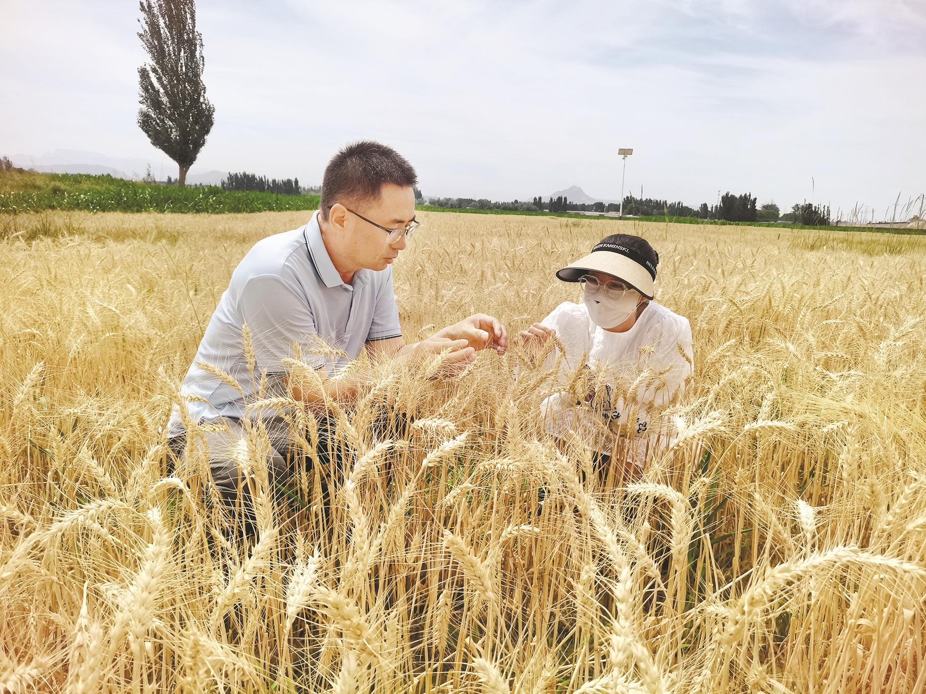 近日,海勃湾区千里山镇王元地村驻村工作队工作人员查看小麦成熟情况,全力确保粮食归仓。 (毕晓敏 摄)