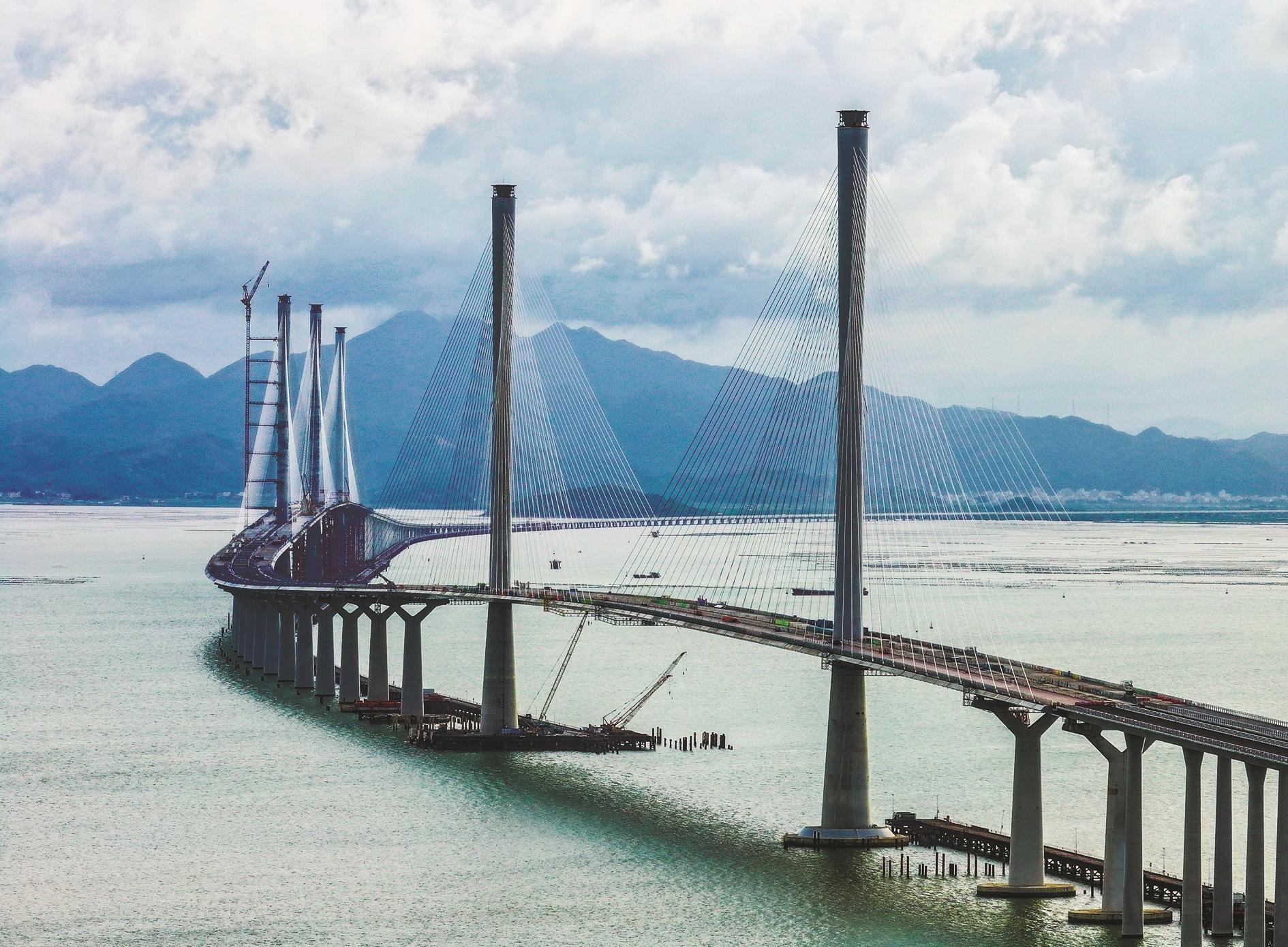 黄茅海跨海通道高栏港大桥(右)和黄茅海大桥(7月16日摄,无人机照片)。目前,中交路建承建的黄茅海跨海通道高栏港大桥已经进入索塔塔身涂装施工,被誉为海上“小蛮腰”的索塔单座涂装面积近万平方米。黄茅海跨海通道是粤港澳大湾区又一超大型跨海工程,连接珠海市和江门市,线路全长约31公里。跨海段由高栏港大桥和黄茅海大桥两座主桥组成,项目预计2024年年底通车。 新华社记者 刘大伟 摄