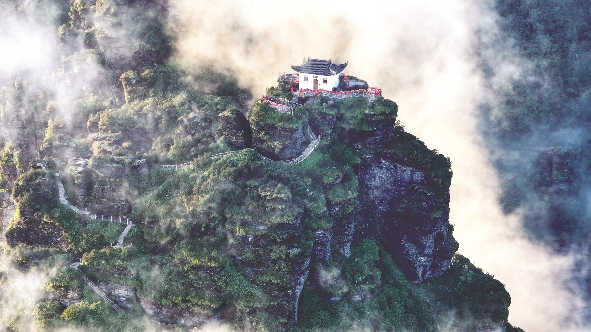 7月15日在贵州梵净山老金顶拍摄的云雾景观。入伏以来,世界自然遗产地梵净山时而云海翻滚,时而云雾缥缈,霞光红云,美不胜收。
