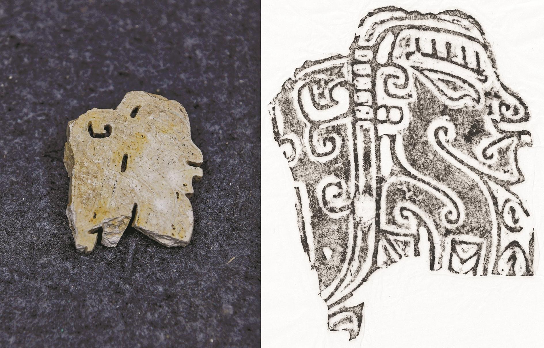 拼板照片:左图是今年7月10日在四川省文物考古研究院拍摄的玉石上阳刻的侧身人像(新华社记者 王曦 摄);右图是玉石上阳刻的侧身人像拓片(新华社发 四川省文物考古研究院供图)。