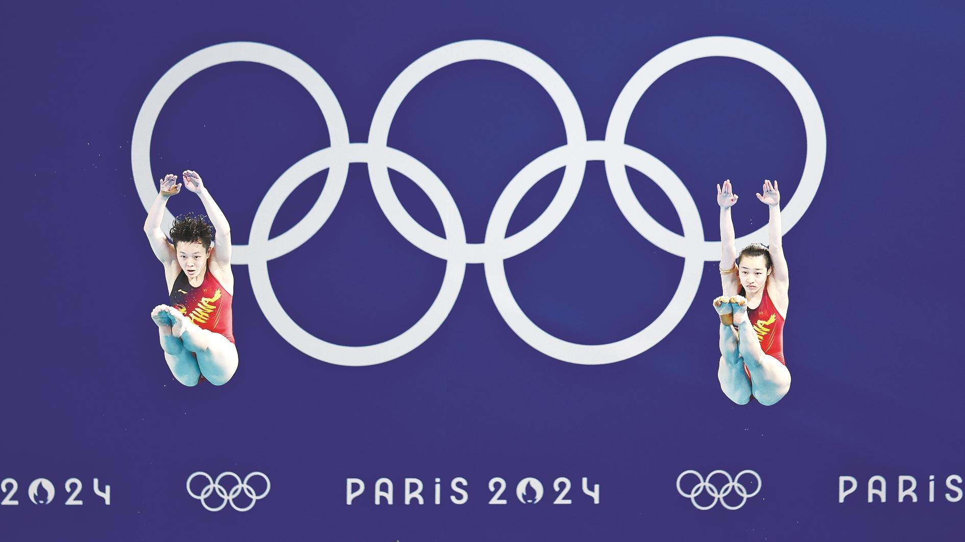 7月27日,中国选手昌雅妮(右)/陈艺文在比赛中。当日,巴黎奥运会跳水女子双人3米板决赛在巴黎奥林匹克水上运动中心举行。