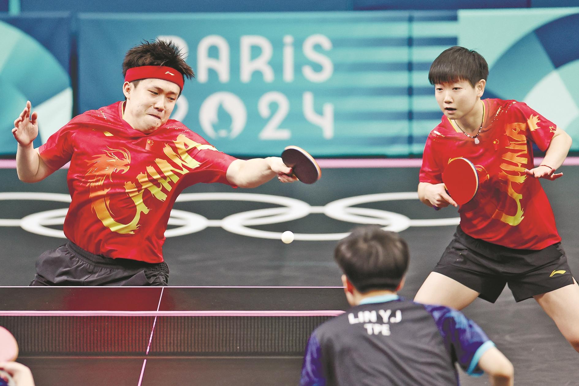 7月28日,王楚钦(左)/孙颖莎(右)在比赛中。当日,在巴黎奥运会乒乓球项目混合双打四分之一决赛中,中国组合王楚钦/孙颖莎4比2战胜中国台北组合林昀儒/陈思羽,晋级半决赛。 (新华社记者 刘续 摄)