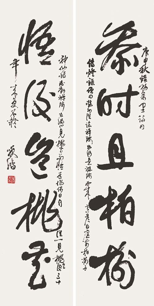此联笔意凝练、结体宽博,字里行间浸透着古朴遒劲、酣畅淋漓的雅味清趣。上款为“庚申秋录杨万里诗句”,下联在题识文末署“笑鸿”名款,钤白文“朱笑鸿”印。庚申年为1980年,据此联收藏者章容明称,时值章楷(现为中国美术学院国艺城市设计研究院副院长)出生,此为朱笑鸿先生当日向章父、著名剧作家章甫秋先生登门贺喜之物。