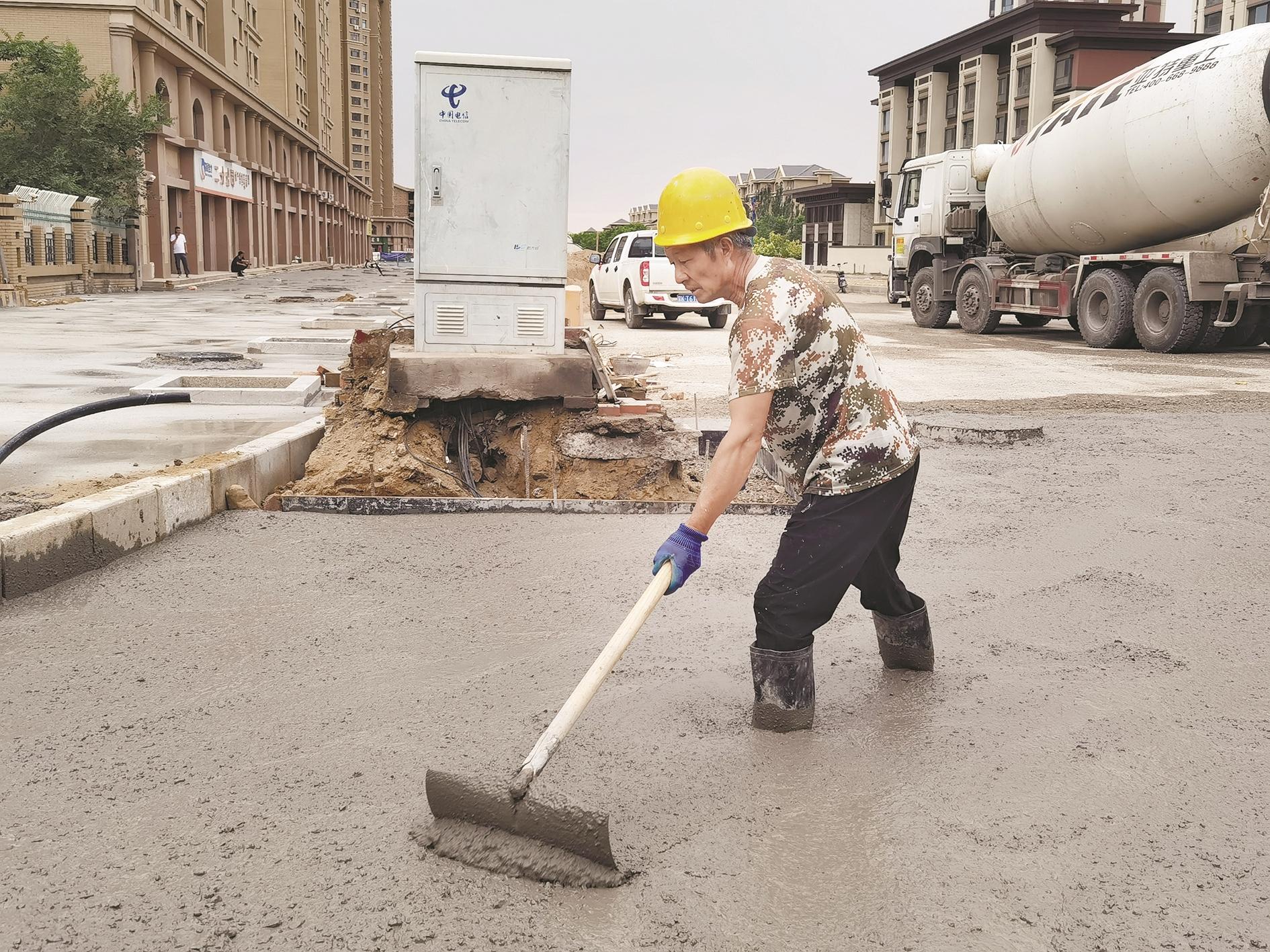 近日,在海勃湾区双拥西街改扩建工程现场,搅拌车轰隆作响,混合好的水泥砂浆正源源不断地向路面倾泻着,几名工人脚穿水鞋站在砂浆中,手持工具摊平。