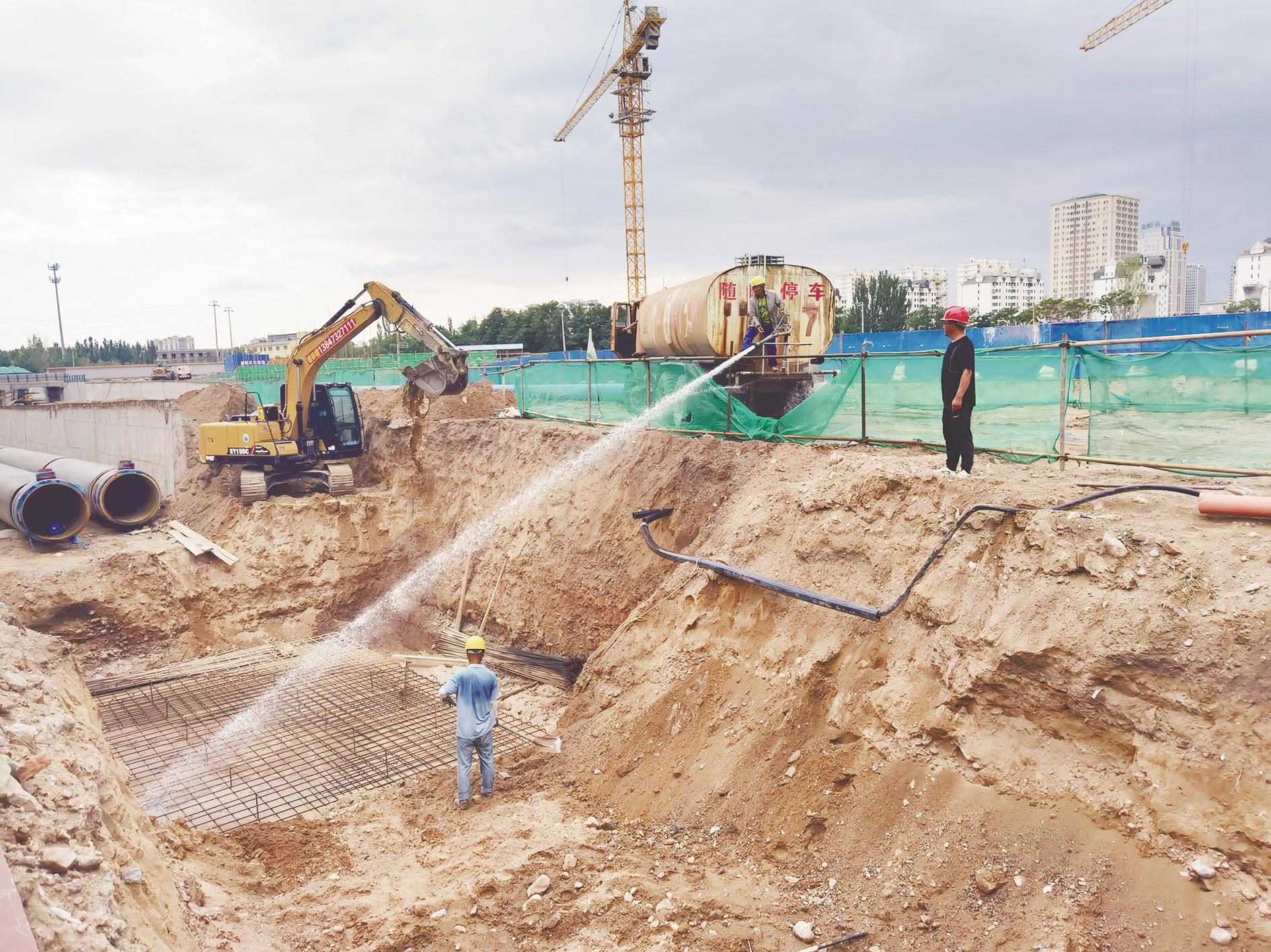 7月30日,记者在海勃湾区车站南路及立交桥改造工程现场看到,起重机、挖掘机等各种工程车辆来往作业,这边工人们在挖机、洒水车的助力下开展管道井施工作业;挡墙附近,吊车吊起挡墙模板,在人工的辅助下进行安装;那边,铲土机对已完工的管道区域进行回填……