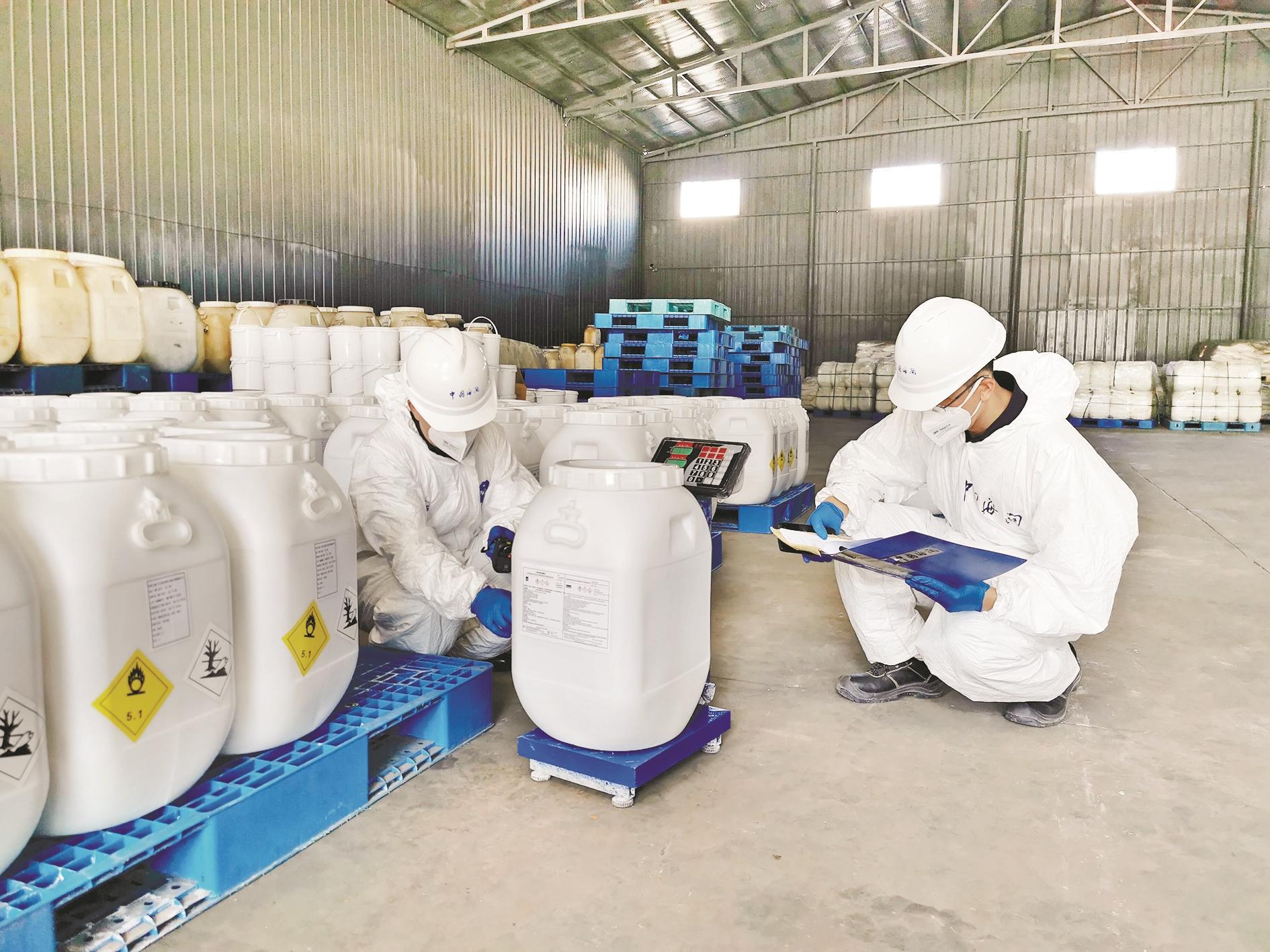 近日,在乌海海关的监管下,5吨二氯异氰尿酸钠从连云港口岸驶出,即将进入菲律宾市场。这是我市所产的消毒制品首次出口菲律宾。图为海关关员查验商品属地。(王超 摄)