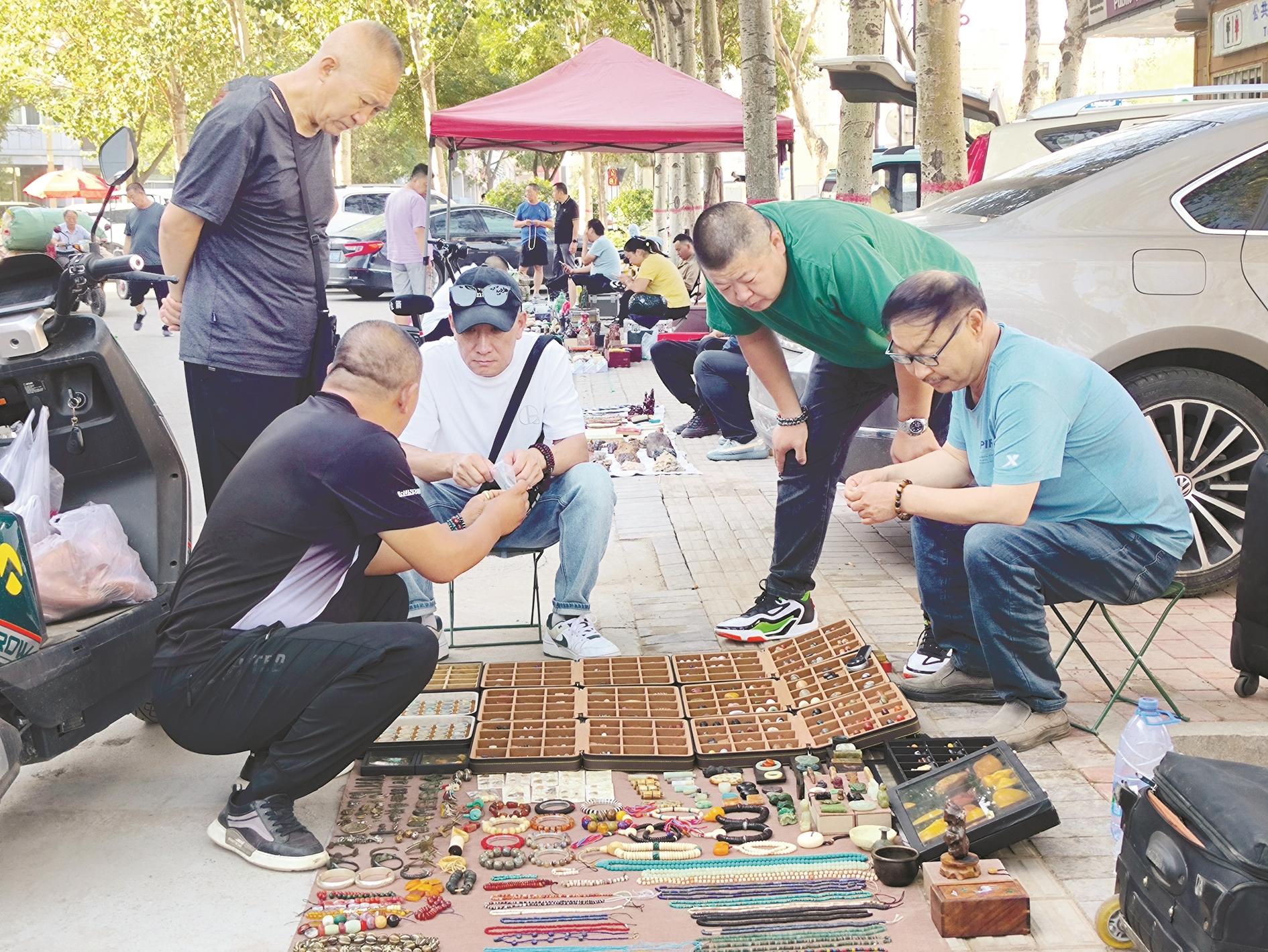 每逢周末,海勃湾区青山市场附近的奇石假日市场便会准时开张,吸引众多奇石爱好者前来“淘宝”。图为8月4日,奇石爱好者在奇石假日市场品鉴、购买奇石。 (路静 摄)