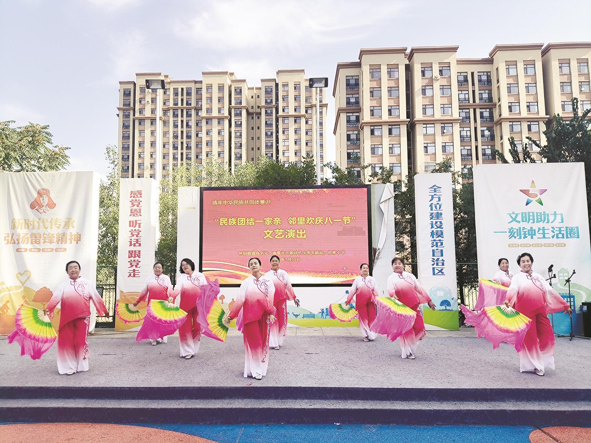 7月31日,海勃湾区林荫街道办事处、林荫街道海馨社区新时代文明实践站、海勃湾区依林小学共同开展“民族团结一家亲 邻里欢庆八一节”文艺演出活动。活动中,文艺团体为居民带来了精彩的文艺表演,学生向退役老兵献花。 (李浩 摄)