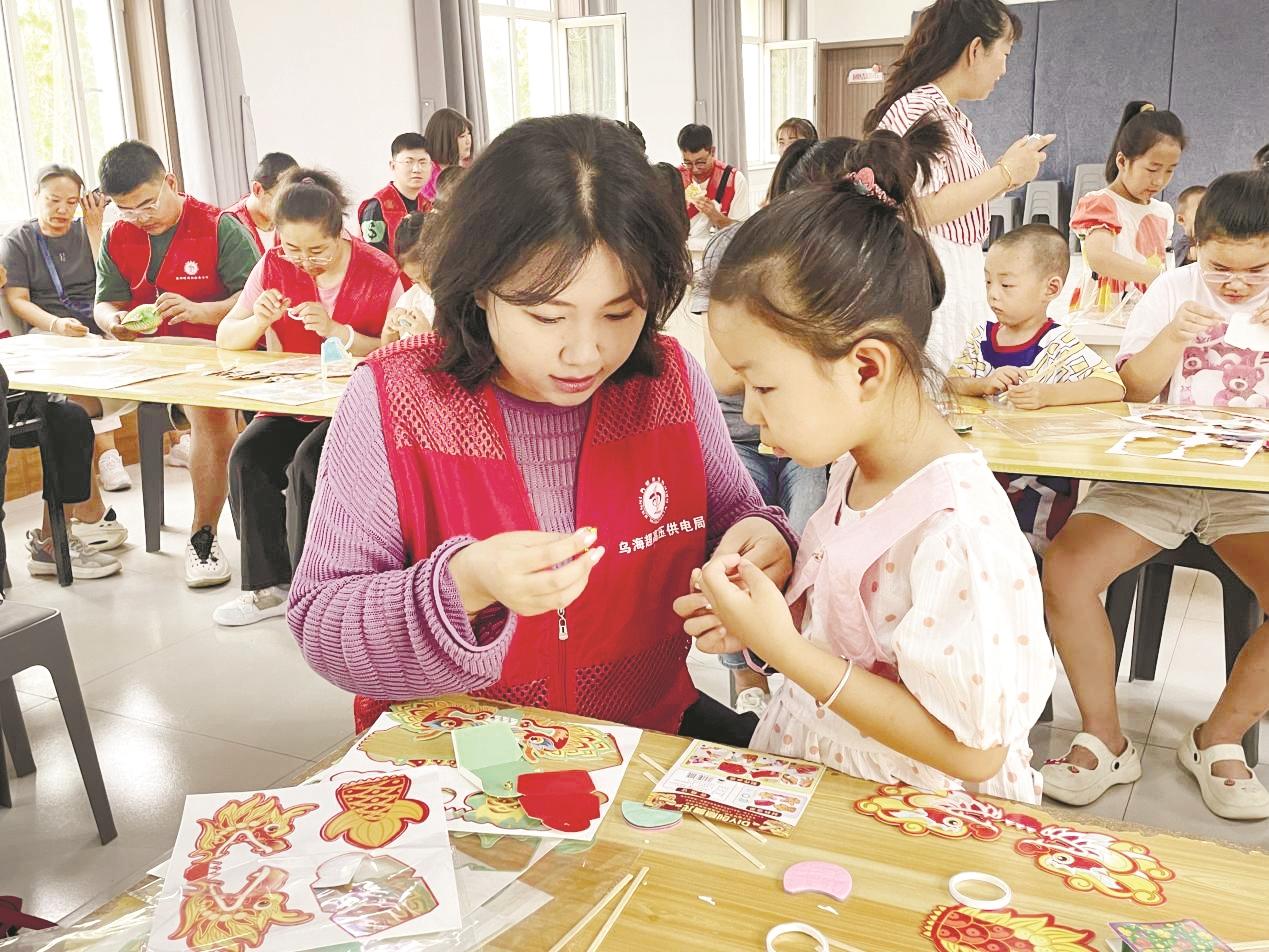 为进一步推广和传承非物质文化遗产,丰富社区青少年的精神文化生活,海勃湾区新华西街道海达社区新时代文明实践站联合内蒙古电力集团乌海超高压供电公司,开展“传承非遗之美,体验翻花乐趣”暑期公益课堂。图为志愿者指导辖区青少年完成翻花作品。 (毕晓敏 摄)