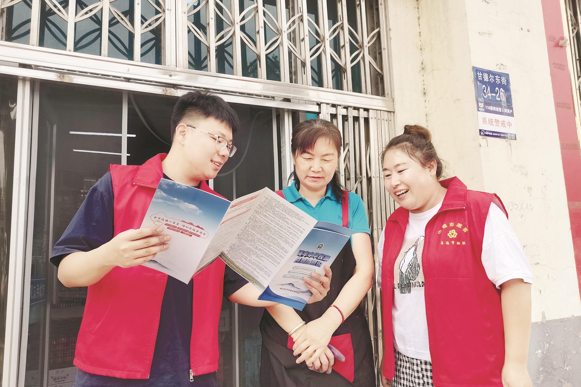 近日,海勃湾区新华街道新海社区开展了铸牢中华民族共同体意识宣传活动。活动中,社区志愿者、网格员通过走访商户住户、分发资料、现场讲解等形式,宣传党的民族政策和法律法规,引导辖区各族群众在交往交流交融中进一步铸牢中华民族共同体意识,共同创建全国民族团结进步示范市。