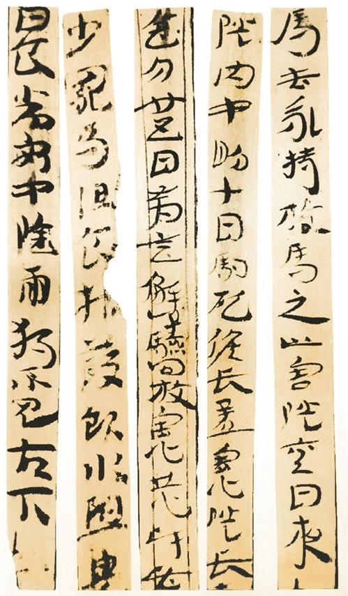 《居延汉简》烂漫多姿,结字多取险绝之势,横画一波三折,多起伏,竖画多摆动,半包笔画多圆转,点画多欹侧,行笔较少使转与绞转。这些形态与古人的书写工具、书写习惯是分不开的。简书多用木牍与竹简,执简牍于手,率意书写,随意生发,掺杂行草笔意于其中,点画从不同方向入纸,结字出其不意,稚拙可爱,貌似无规矩可言,其实法度森严。