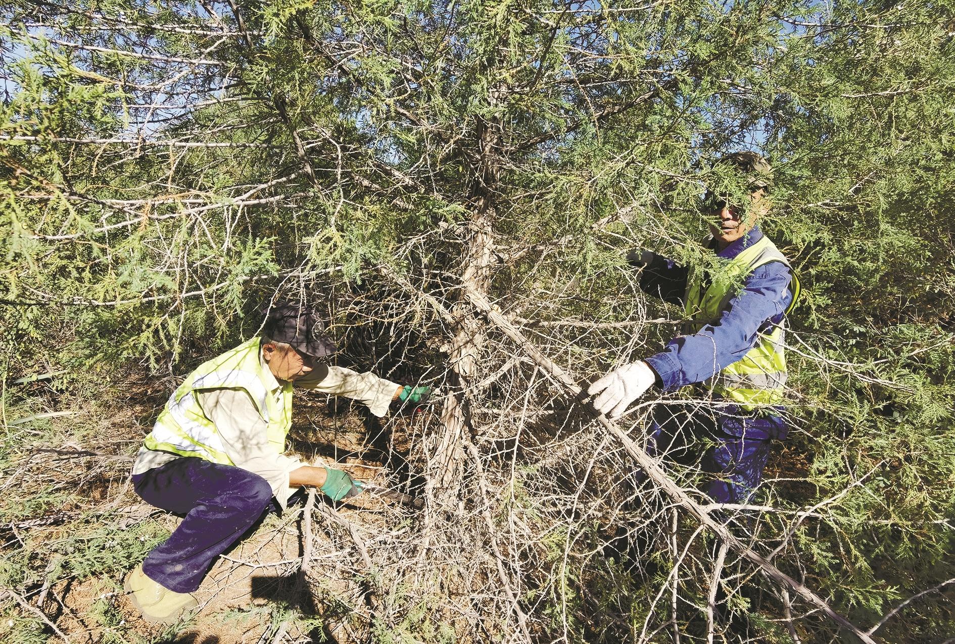 记者见到市林业和草原建设服务中心林业管护科副主任刘永胜时,他正带着工人在林区进行侧柏桧柏树木提干、林灌混交区灌木平茬工作。他指着桧柏告诉记者,树木靠近根部长出的枝条既影响植物上方吸收营养,又有火险隐患,而在秋末冬初时节,林区灌木的地上部分变得枯黄,火险隐患也会增加。8月9日我市大范围降雨后,管护科工作人员便开始林区的平茬、提干、清理等工作。