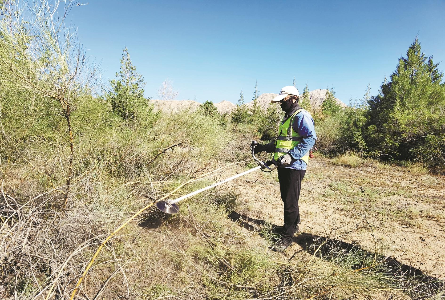 “别看树木枝条柔软,可真要在其间作业,迷彩的长衣长裤和运动鞋是必需的,如果穿个针织材料的衣服,没走几步,身上就会沾满枯枝和蒺藜,戴帽子、手套、围脖不仅是为防晒,最重要的是防止划伤皮肤。”一名包裹严实的工人边说边露出晒得黝黑的皮肤说,“其实,男人哪有那么娇气,忙起来根本顾不上装扮自己,拎着工具就进林子了。”