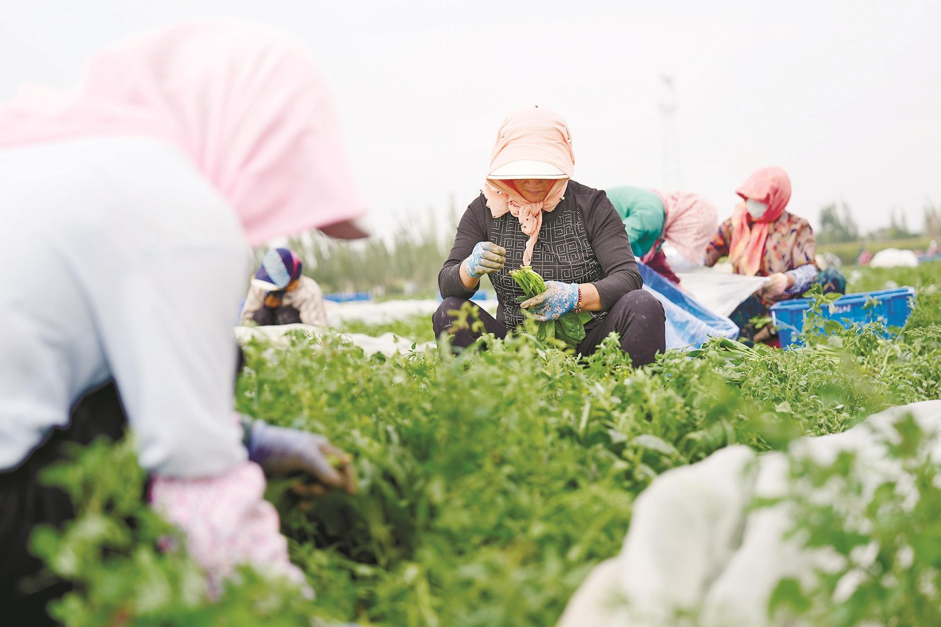 宁夏固原市原州区彭堡镇姚磨村瑞丰蔬菜产销合作社农户在田间采摘蔬菜(8月24日摄)。近日,地处西北黄土高原的宁夏固原市原州区彭堡镇姚磨村冷凉蔬菜基地迎来热销季。近年来,当地因地制宜发展冷凉蔬菜产业,目前已建成选种、育苗、种植、销售为一体的冷凉蔬菜产业链,各类产品远销广州、北京、上海等地。 新华社记者 王鹏 摄