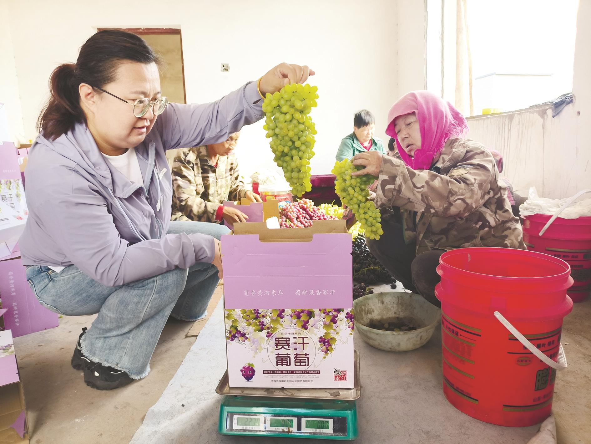 今年,海南区拉僧庙镇赛汗乌素村盘活闲置集体用地打造的百亩葡萄园迎来首次丰收,村“两委”和驻村工作队积极开展葡萄销售工作,助力集体经济增收。图为近日,该村根据订单采收、包装葡萄。 (路静 摄)