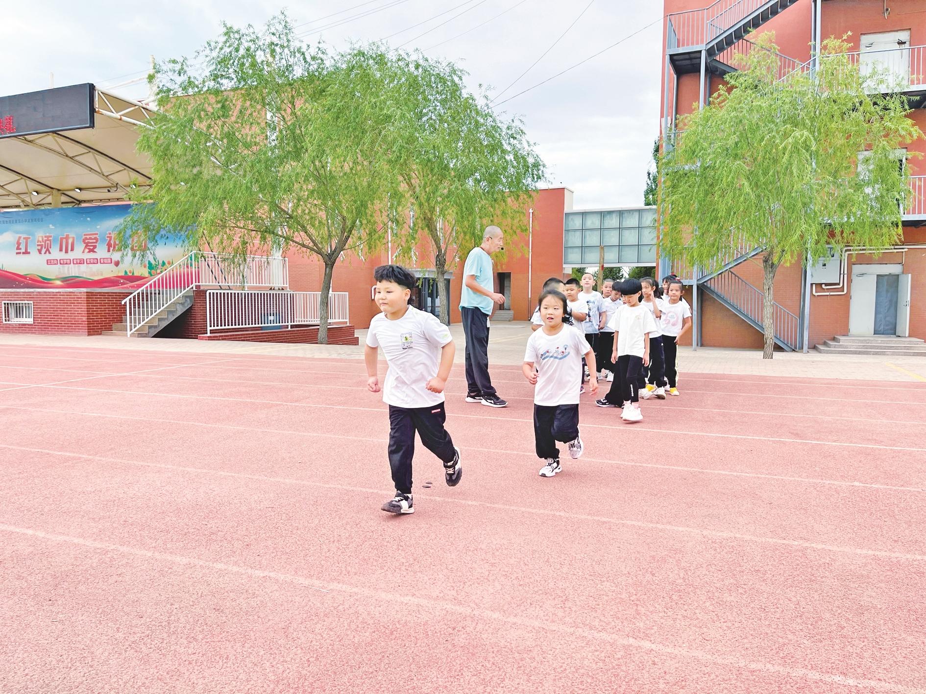 图3:海勃湾区第五小学龙游湾校区一年级学生在老师的带领下熟悉校园环境。 (王江宇 摄)