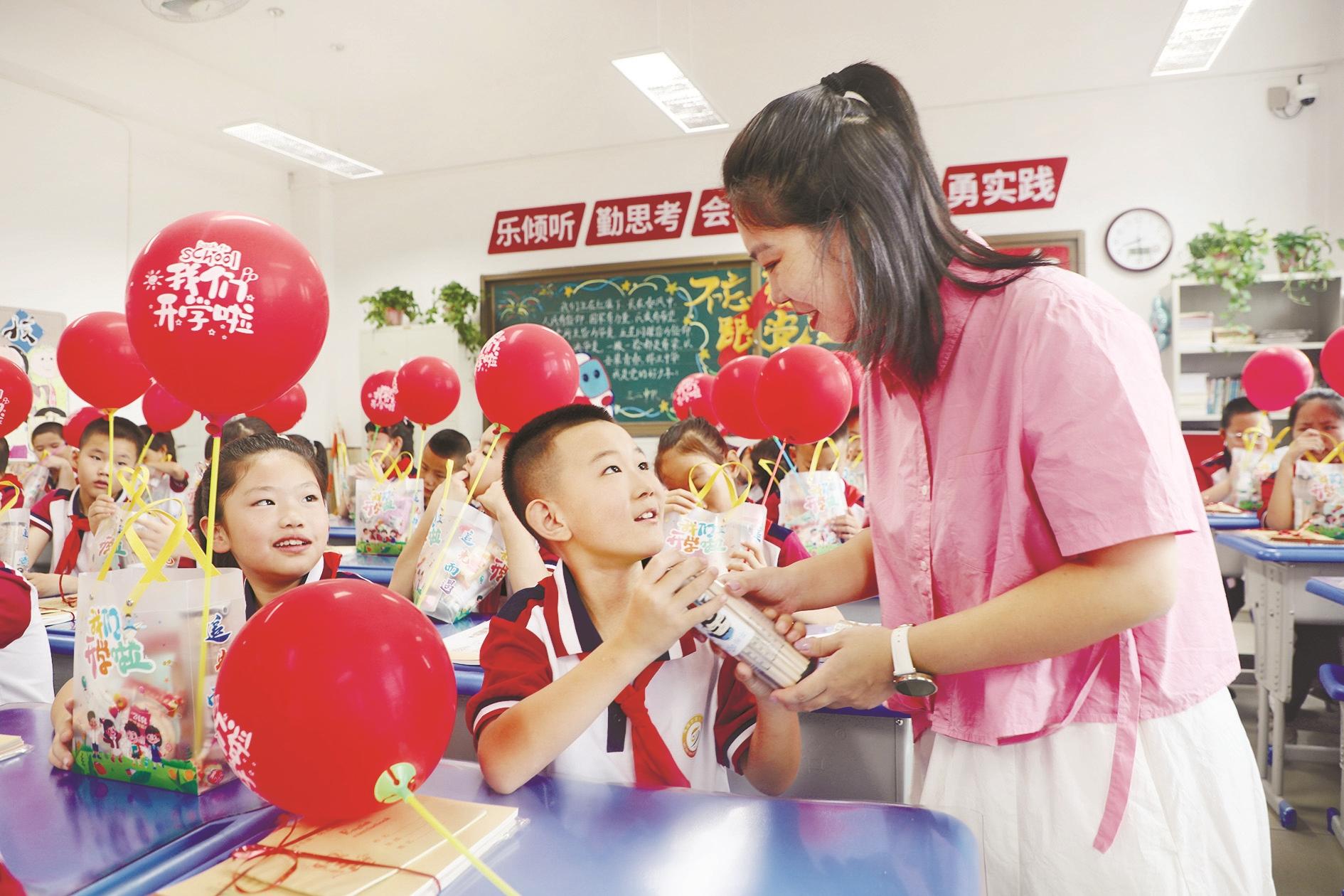 图4:市第九中学三年级二班老师向学生赠送“开学礼包”。 (高瑞鹏 摄)