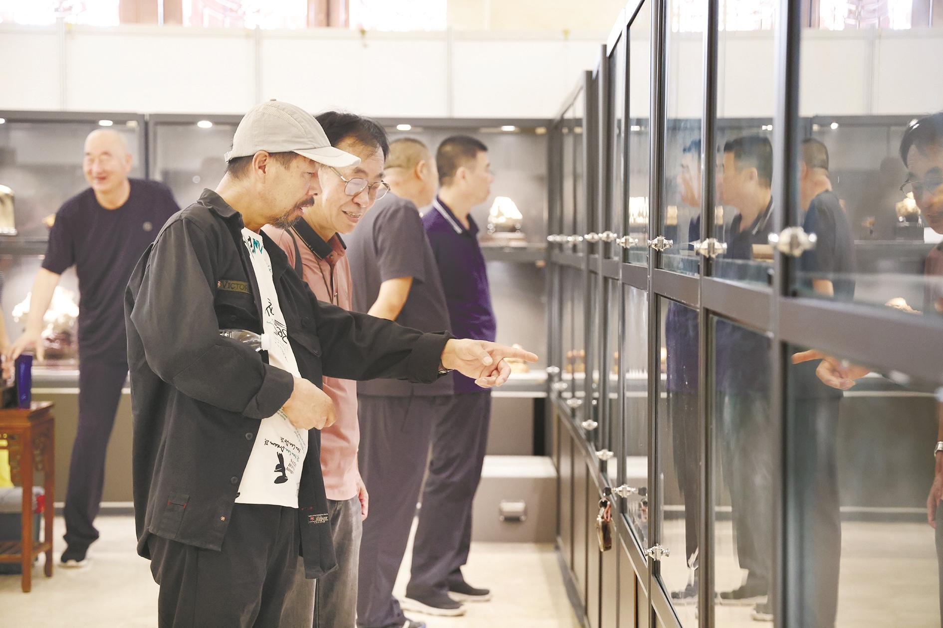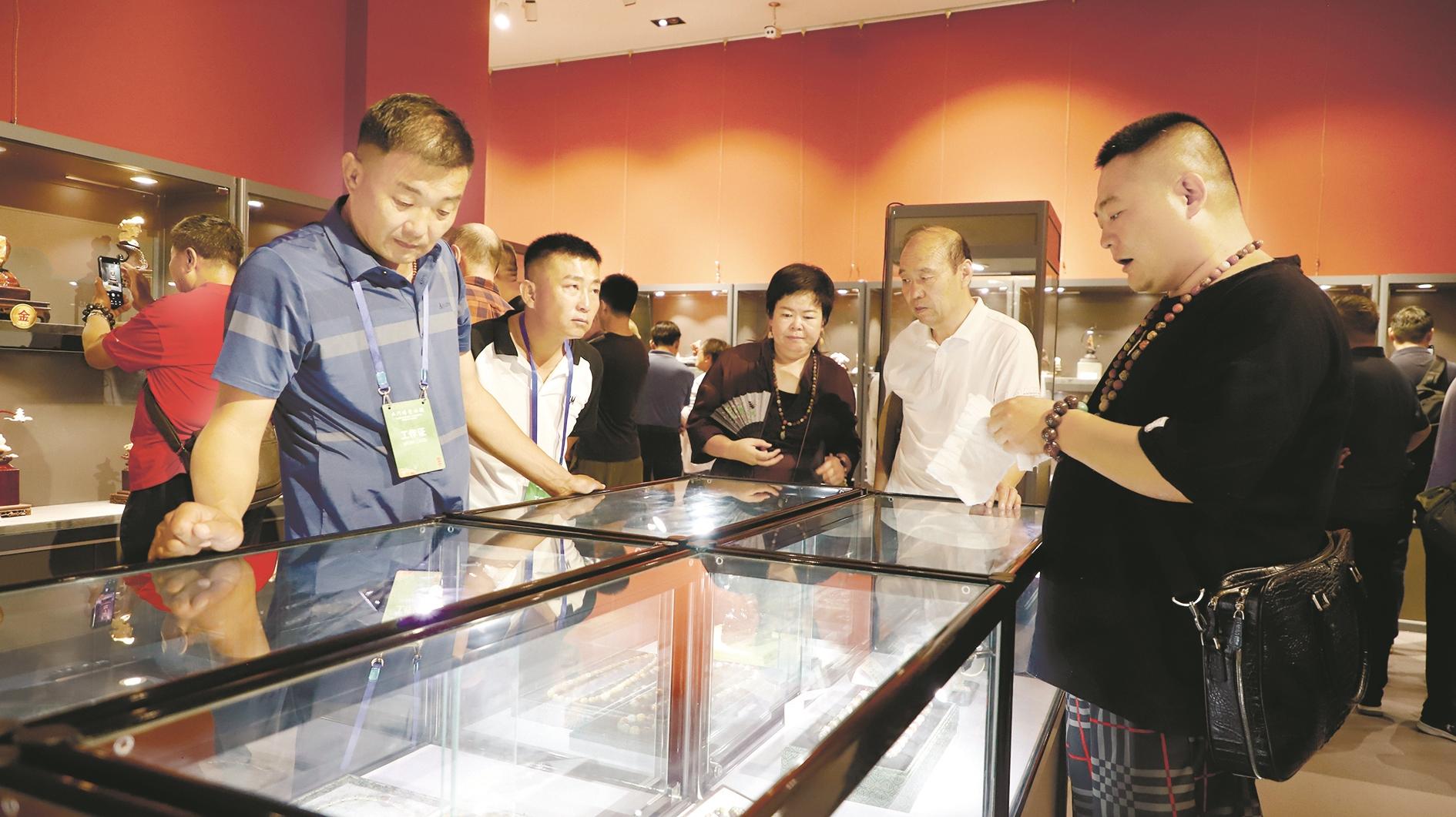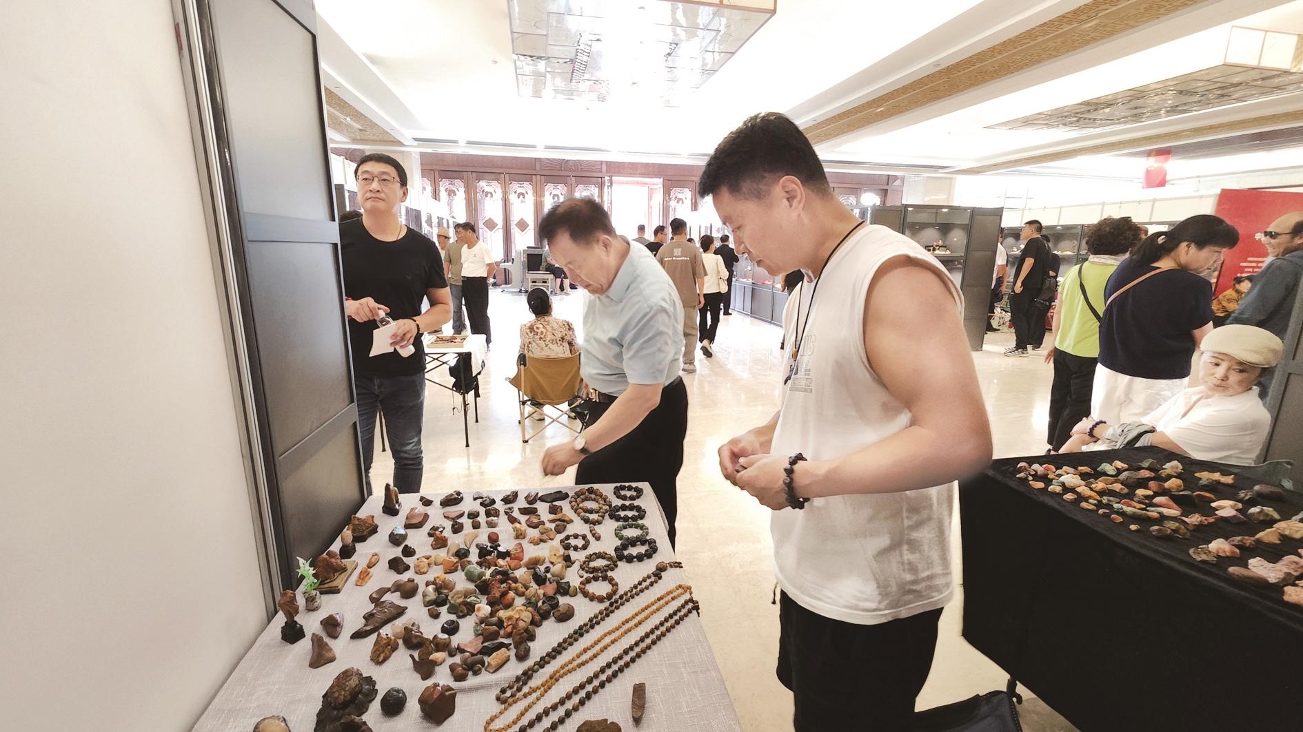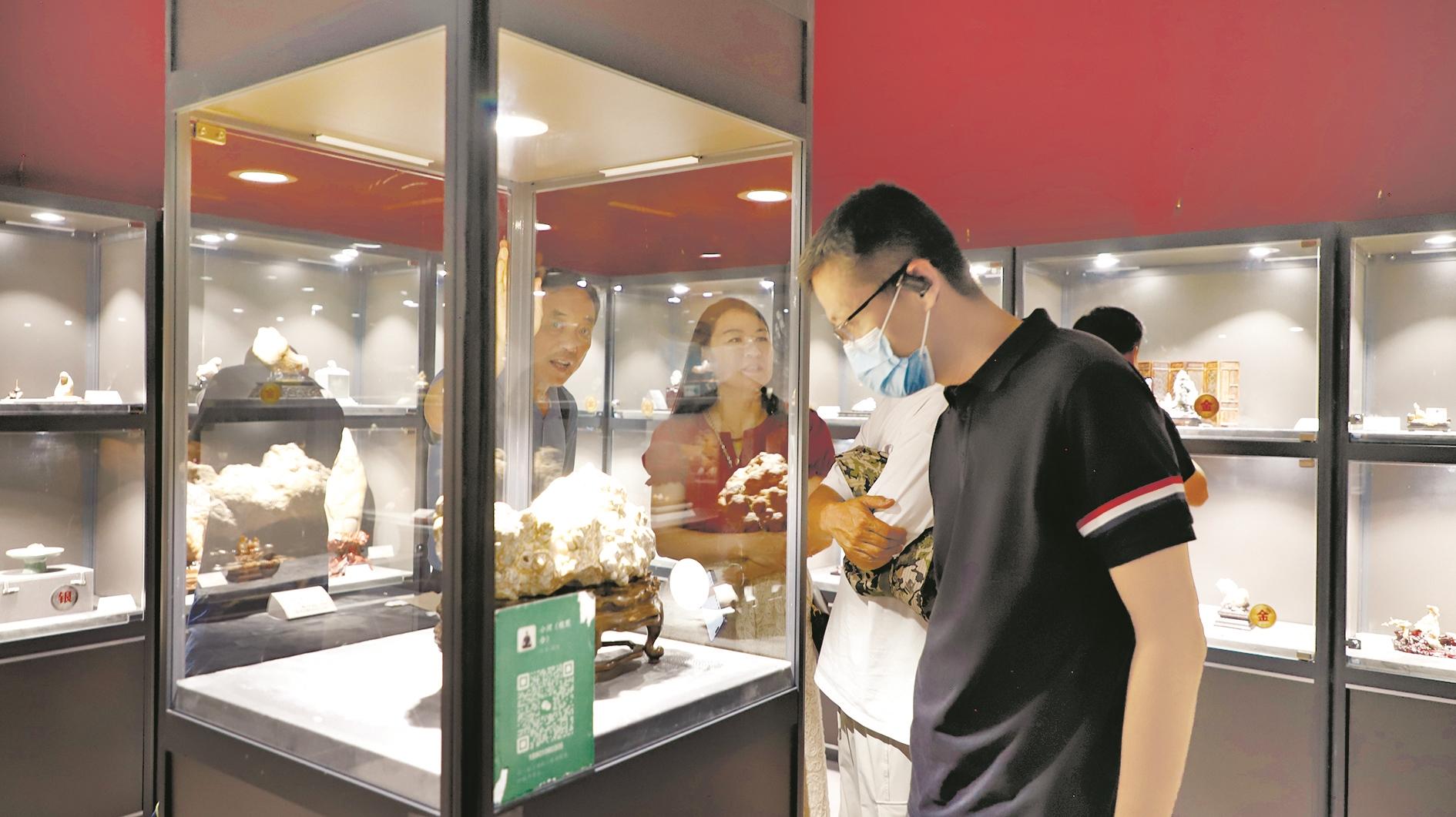 精品赏石区内,赏石爱好者观赏奇石作品。(高瑞鹏 摄)