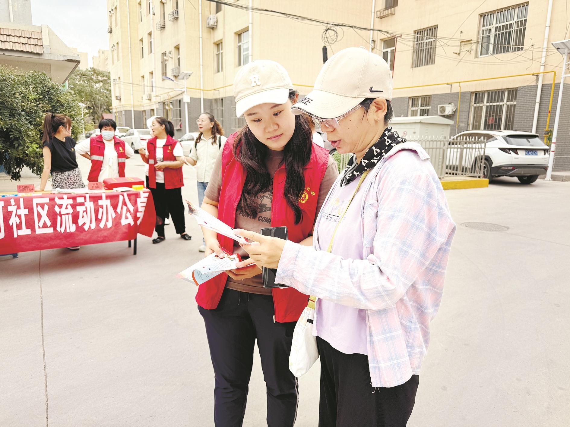 近日,海勃湾区海北街道黄河社区工作人员走入馨佳苑小区,通过问卷调查、设摊宣传等多种方式宣传文明城市创建工作,倡导市民从个人做起,从日常生活做起,共建文明城市。 (段维娜 摄)