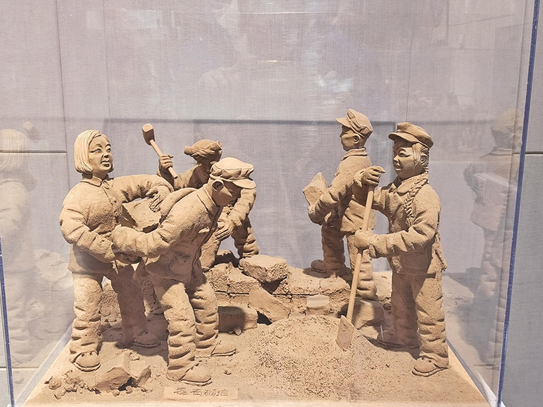 在海南区巴音陶亥镇万亩滩村农耕文化陈列馆的一间窑洞里,摆放着一些黄土民俗泥塑作品,作品中的场景有耕种麦田、有修建土窑、有赶车进城、有集体收割……人物或肩挑背扛、或蹒跚前行、或三两谈笑、或静坐独思……作品惟妙惟肖、栩栩如生,参观者震撼之余不禁竖起大拇指称赞:“这泥塑,神情动作像活了一样。”