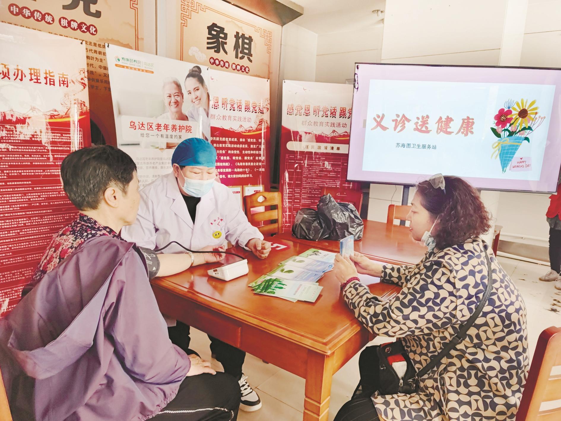 乌达区结合居民实际需求,优化健康医疗体系。新达街道打造“新达格格”服务品牌,依托“护老+科技”,开启“智慧护老”服务新模式,派遣网格员上门为辖区独居老人安装门磁,并用网格员手机号码绑定门磁,作为监测老年人身体状况的依据,若老年人在固定时间段内没有出入记录,社区网格员会及时上门看望或电话联系,防止老年人发生意外。乌达区还结合居民实际需求,合理利用闲置医疗资源,将10余处核酸采样亭“变身”为智慧生命驿站、老年活动室等场所;各社区卫生服务中心共组建家庭医生签约团队24组,截至目前,累计签约常住居民52788位,举办52次健康讲座、23次义诊活动,为4698人免费体检;今年,在辖区内增设10余处“健康驿站”“健康小屋”,免费为居民提供基本项目体检、慢病预防等多项健康管理服务。
