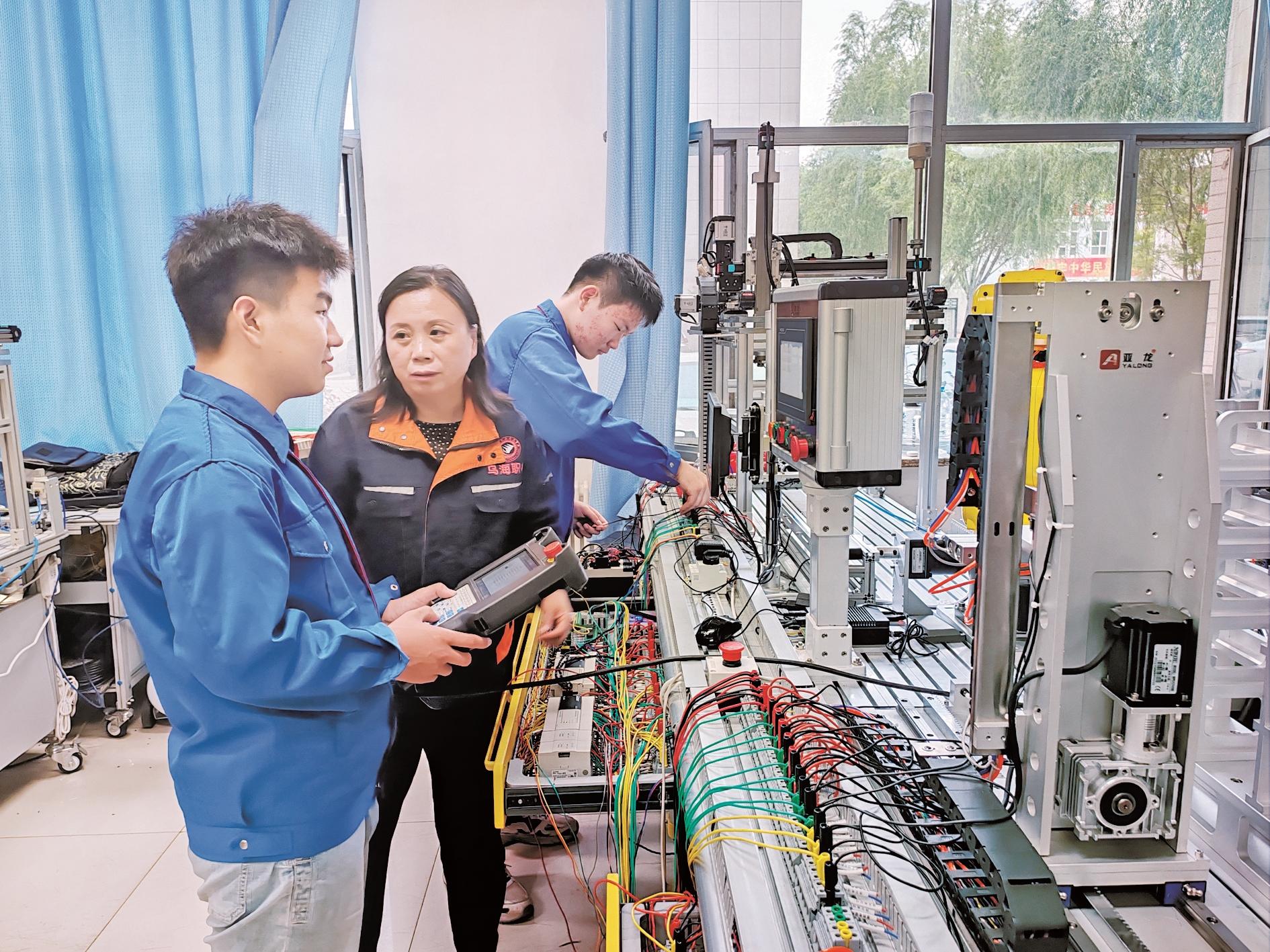 “注意,接线一定要细致,尽量避免出差错。”在乌海市职业技术学校机电一体化设备实训室,老师带着学生模拟“通用机电设备安装与调试”比赛。在其他实训室,都是相似的场景,学生都在模拟比赛,老师及时发现问题指导改正。