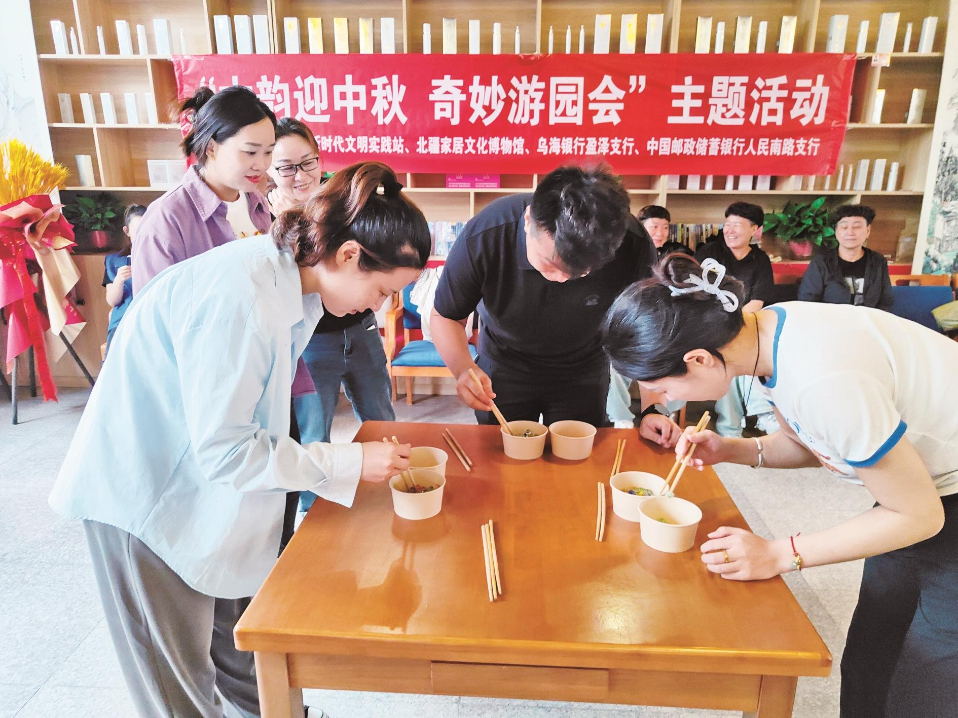 近日,海勃湾区新华街道和谐社区新时代文明实践站举办“古韵迎中秋 奇妙游园会”主题活动,通过“海底捞月”“欢乐月饼蹲”等趣味游戏,让居民在活动中感受传统文化魅力,同时增进邻里情谊,营造“和谐社区,邻里一家亲”的良好氛围。 (张楚研 摄)