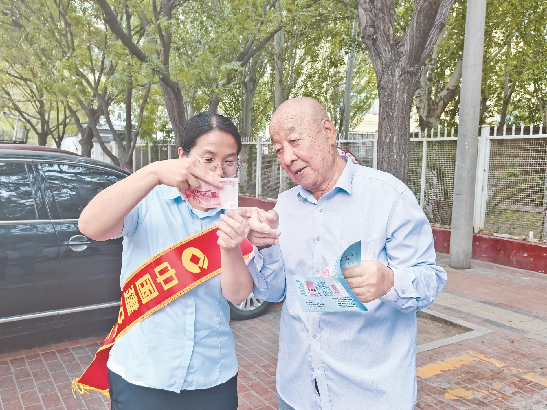 近日,建行乌海分行工作人员在市人民公园开展防范非法集资宣传活动,图为工作人员向市民讲解如何识别假币。 (马旭红 摄)