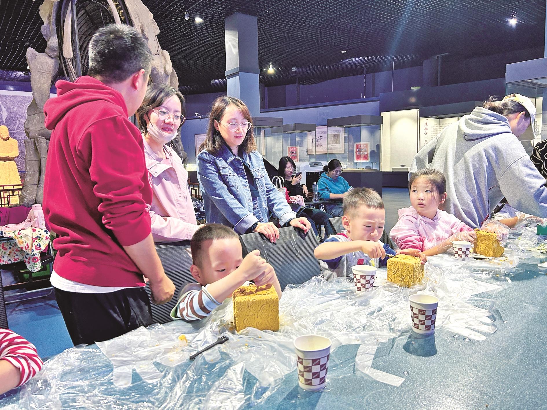 市博物馆举办的“月满中秋·博古雅韵——逛博物馆”系列活动中,小朋友们参与现场体验。 (姚远 摄)